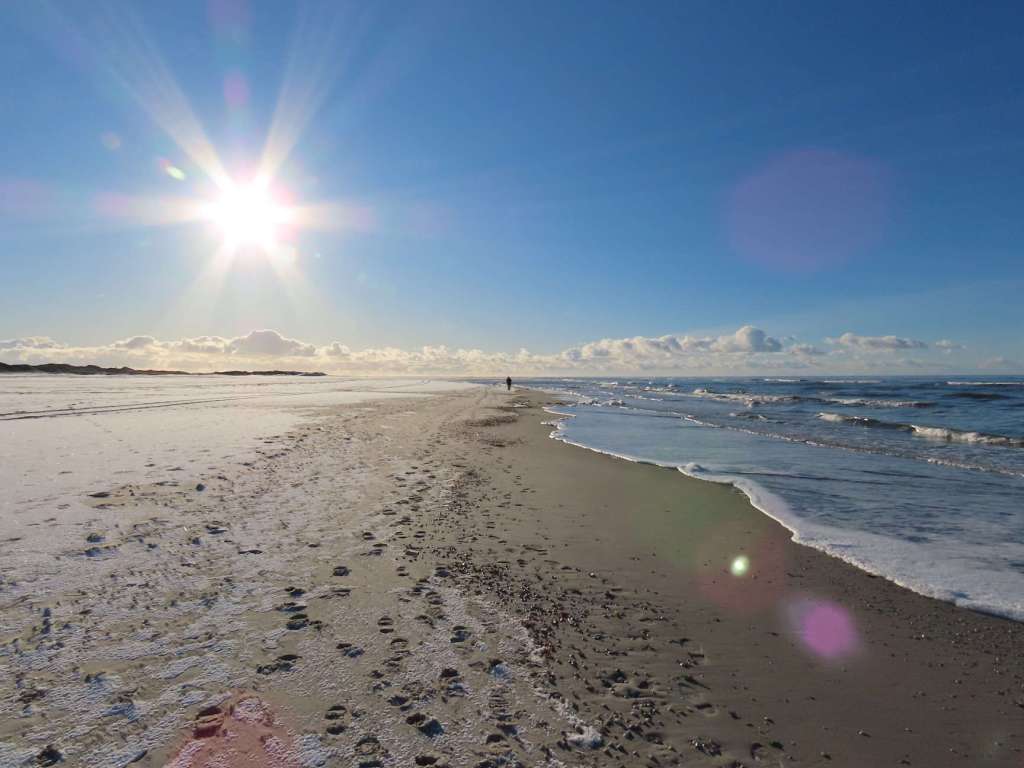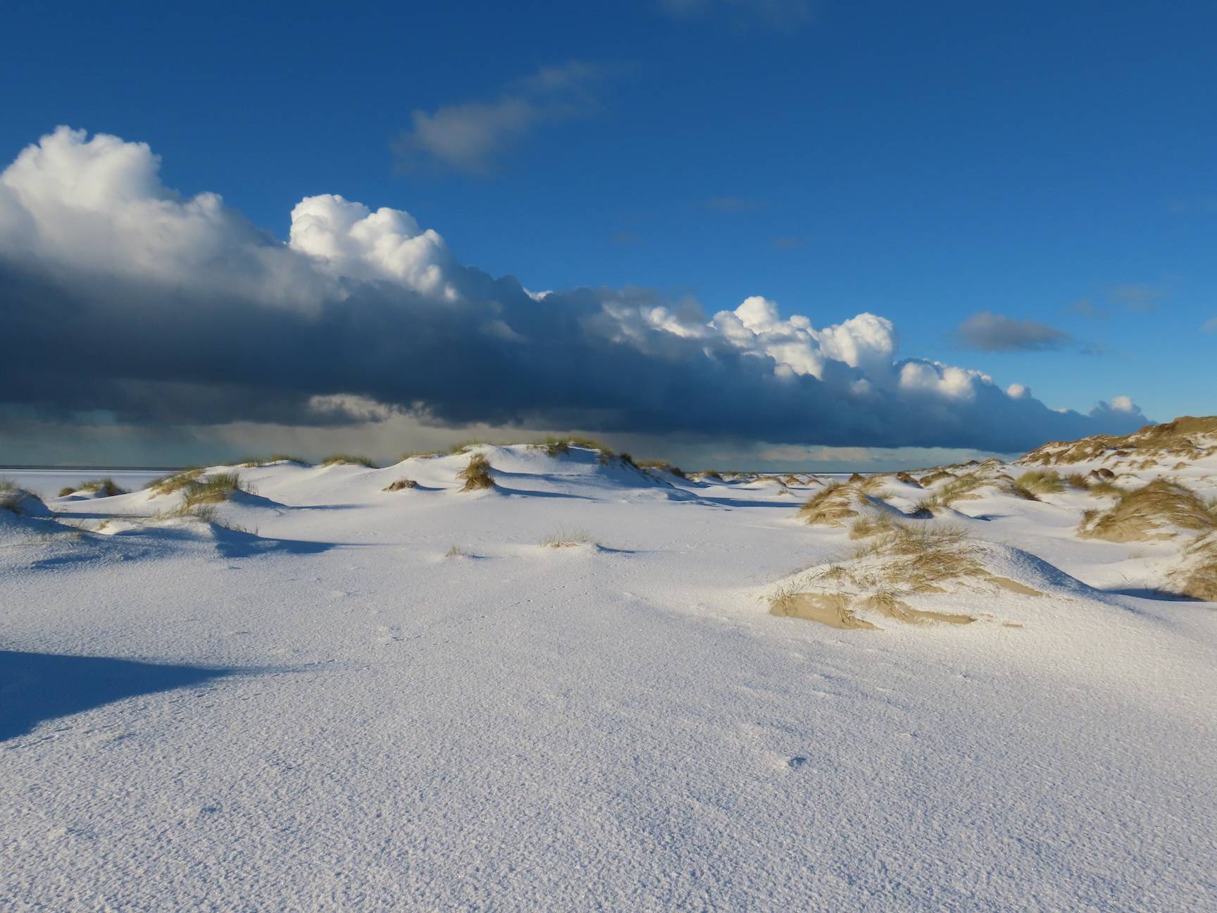 Dieses Jahr waren wir rechtzeitig auf Amrum. Als wir am 21. November von der Fähre fuhren, empfing uns ein verschneites Amrum und das bei herrlichem Sonnenschein. Wir haben dann auch nicht viel Zeit verloren und sind erstmal durch die Dünen zum Strand, vorbei am Wriakhörnsee, also südwestlich von Wittdün. Da ist auch das obige erste Foto entstanden, also am 21.11.2025.