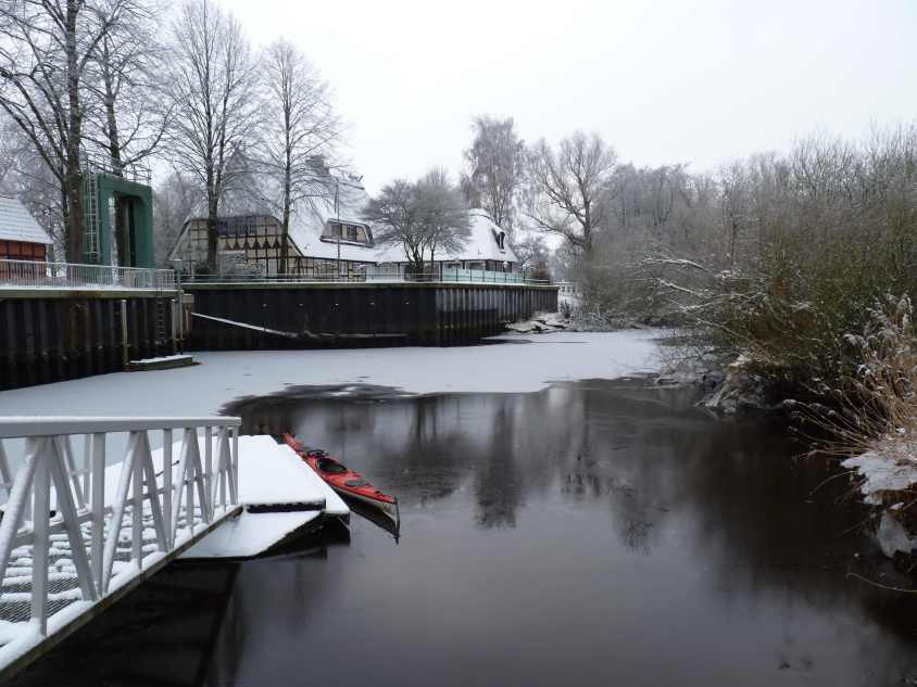 Auch im Januar kann man in Bremen gut mit dem Kajak auf der Wümme fahren. Dieses Foto ist vom 3. Januar 2010 und ich habe es auch schon in der Kategorie „Kajak“ gezeigt. Hier ist der Anleger bei Kuhsiel zu sehen, links das Schleusentor der Schleuse Kuhsiel und rechts davon das gleichnamige Lokal.