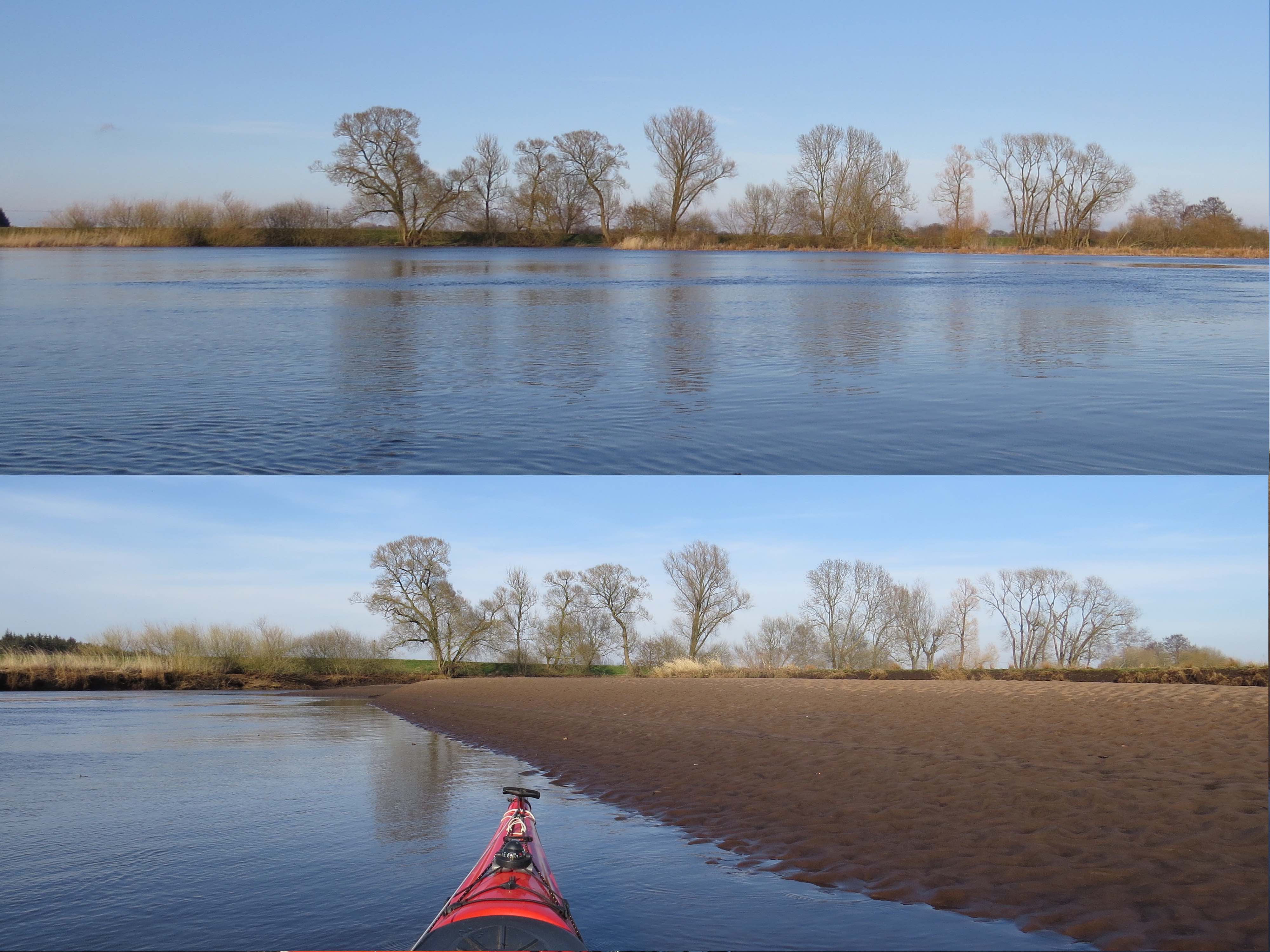 Zwei schöne Tage im April, nämlich am 1. und 7. April 2018. Ich habe diese beiden Fotos zusammengestellt, um den starken Unterschied zwischen Hochwasser und Niedrigwasser auf der Wümme zu verdeutlichen.Tatsächlich musste vor wenigen Tagen jemand auf genau dieser Sandbank überzeugt werden, dass die Sandbank nur bei Niedrigwasser herauskommt und bei Hochwasser überspült ist.