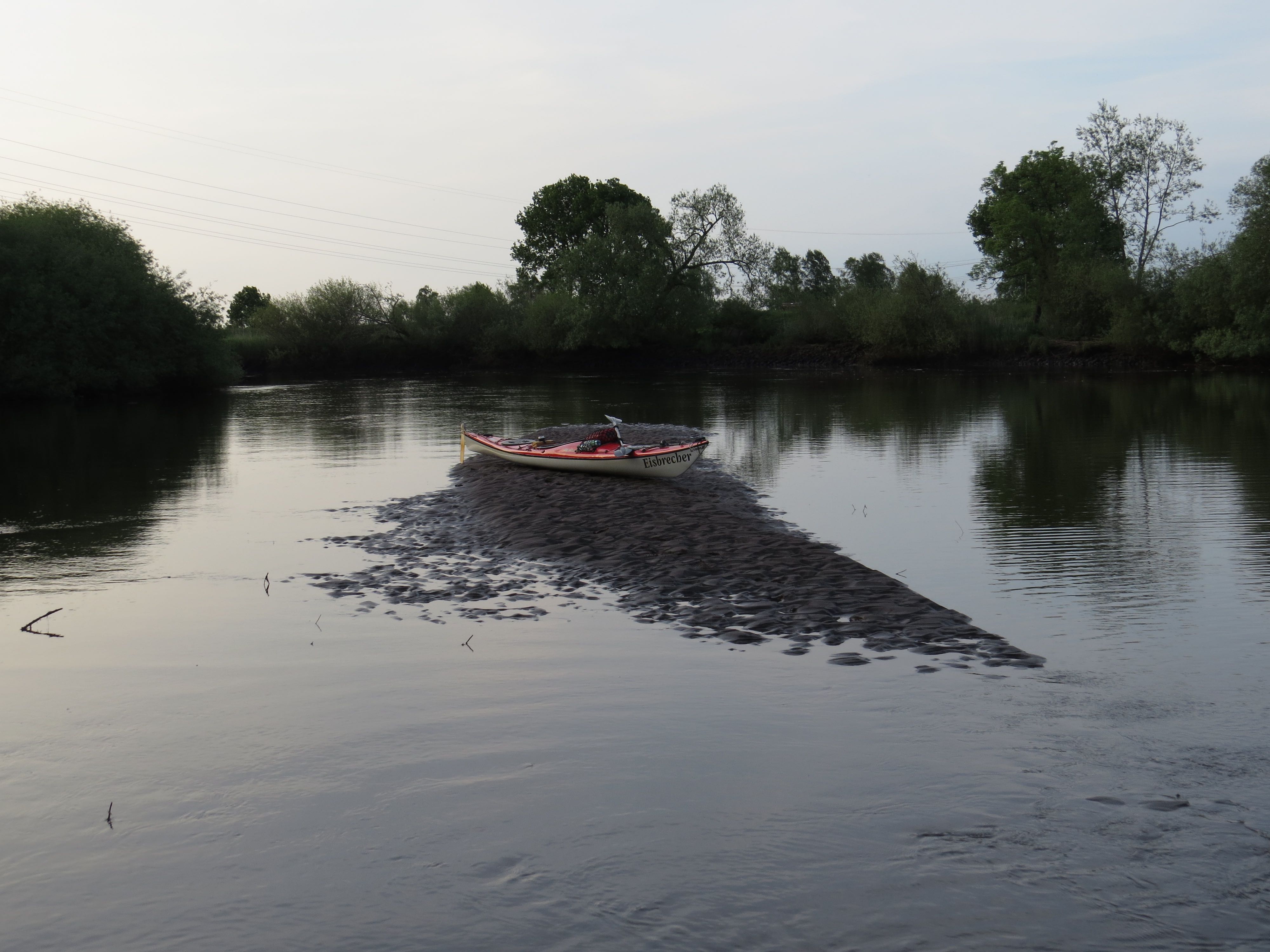 Der Mai 2018 war sehr warm und in Bremen auch sehr trocken. Dieses Foto ist vom 12. Mai 2018, ein sehr schöner Sonnabend, der auch abends noch angenehm warm war und zum Baden auf der gezeigten Sandbank einlud. Das ablaufende Wasser hat auch erst abends diese Sandbank in der Wümme zwischen Kuhsiel und Gartelmann freigegeben.