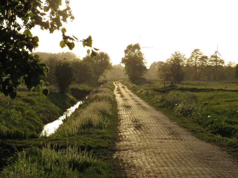 Das ist der Kuhweideweg in Borgfeld, mein täglicher Arbeitsweg. Die Aufnahme ist vom 15. Mai 2015, abends bei etwas Gegenlicht. Das Foto zeigt auch die typische Landschaftsform, nämlich Felder, die von Entwässerungsgräben eingefasst sind.