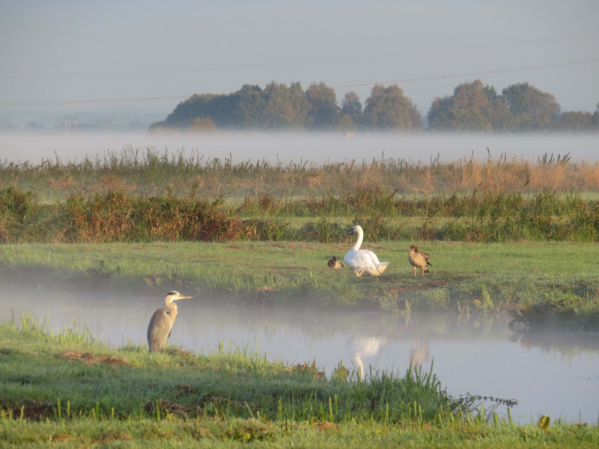 Das Foto zeigt übrigens von links einen Graureiher, eine Stockente, einen Schwan und eine Nilgans.