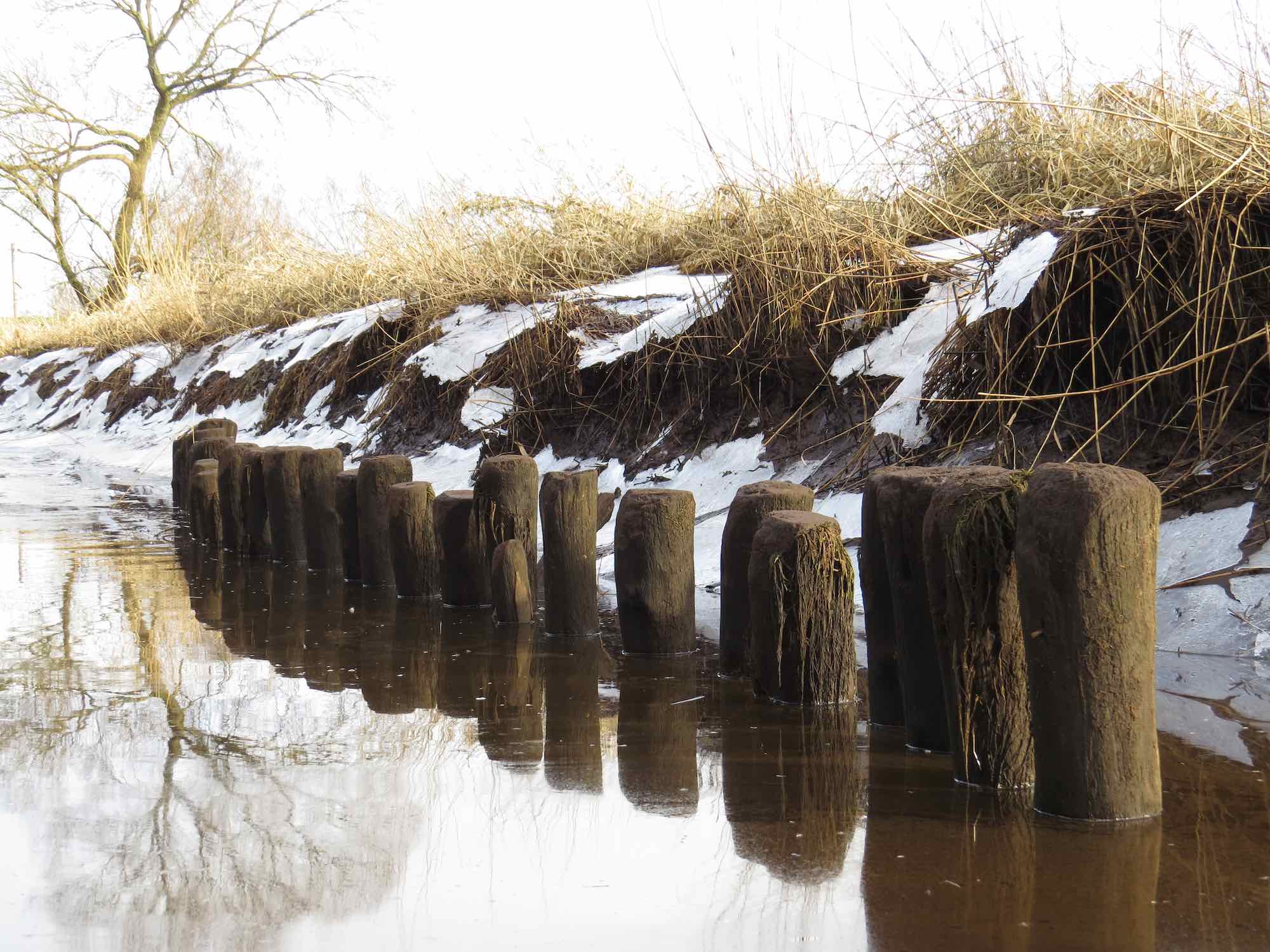 Hier gibt es ein Stichstück von der Wümme zu einem (alten) Durchgang im Deich. Auf beiden Seiten dieses Stichstücks sind solche Dalben. Ich vermute, dass sie zur Uferbefestigung dienen, aber vielleicht hatten sie früher auch eine Bedeutung für Boote zum Anlegen. Die Abrisskante des Schnees zeigt aber, dass das Wasser, jedenfalls im Winter, weit höher steigt als die Dalben, so dass die Dalben dann nicht mehr aus dem Wasser herausragen.