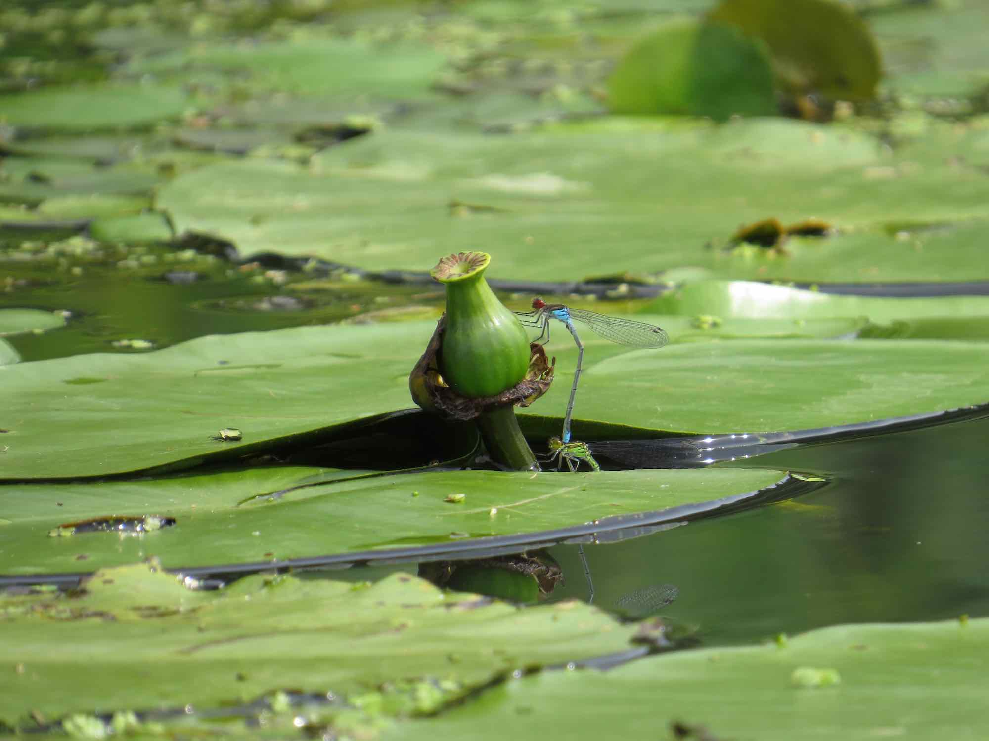 Dieses Foto einer (verblühten) Teichrose mit Libellen bei der Paarung ist schon etwas älter. Ich habe es am 27.7.2013 auf der kleinen Wümme aufgenommen, natürlich beim Kajakfahren. Die kleine Wümme hat fast keine Strömung und daher gibt es dort recht viele Teichrosen. Das Gewässer ist daher auch sehr beliebt bei Libellen.