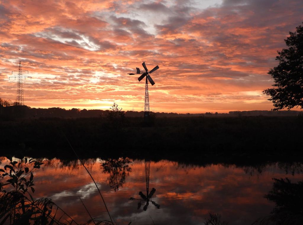 Ich habe immer meine Kamera dabei, wenn ich morgens mit dem Rad zur Arbeit fahre. Dadurch konnte ich auch diese Morgenröte mit dem kleinen Windrad einfangen. Die Aufnahme ist vom 18. Oktober 2019. Das Windrädchen steht am Kuhgrabenweg, gleich neben dem Schelenkampsfleet und war zufällig auch schon im letzten Jahr mein Oktober-Foto 2019.