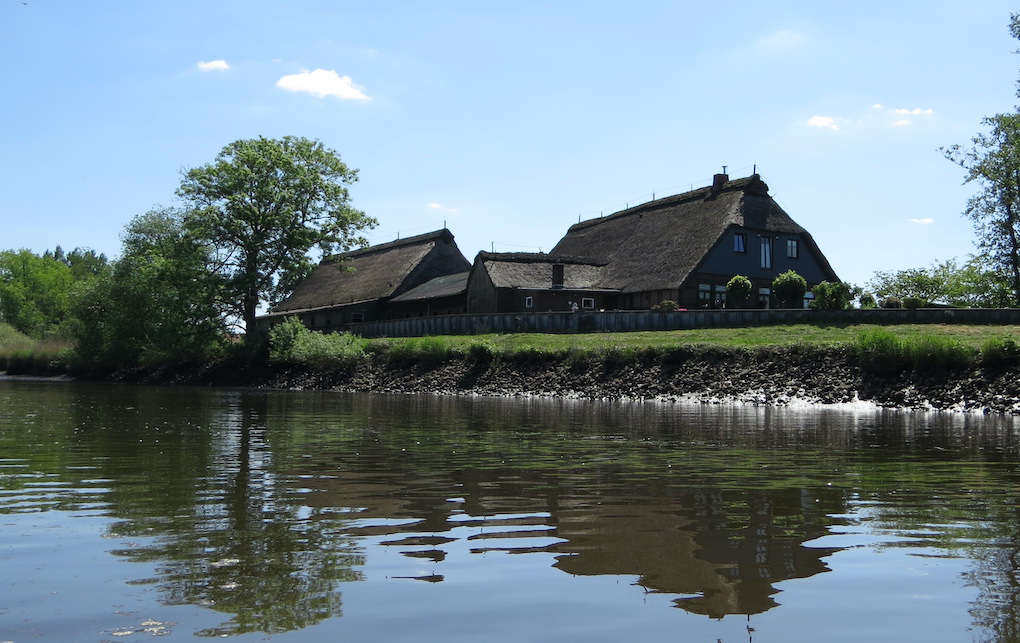 Entlang der Wümme gibt es im Bremer Blockland noch einige intakte Höfe. Die meisten sind hinterm Deich, dieser (Niederblockland 14) ist direkt an der Wümme, mit einer zusätzlichen Spundwand als Schutz gegen Hochwasser. Er ist vollständig mit Reet gedeckt. Das Foto habe ich am 21. Mai 2000 vom Kajak aus aufgenommen.