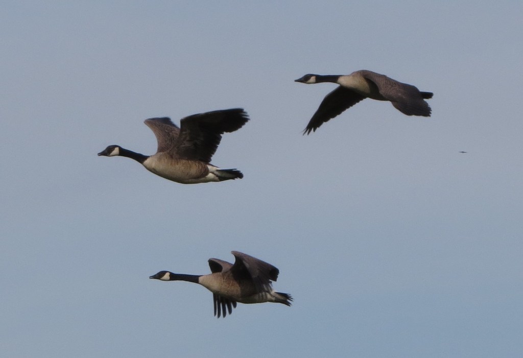 Viele Gänse ziehen durch Borgfeld. Nach Graugänsen sind wohl Kanadagänse am häufigsten, die an dem schwarzen Hals mit dem weißen Fleck am Kopf gut zu erkennen sind. Hier habe ich sie gut im Flug erwischt, am 2. August 2020, in der Nähe der Wümme.