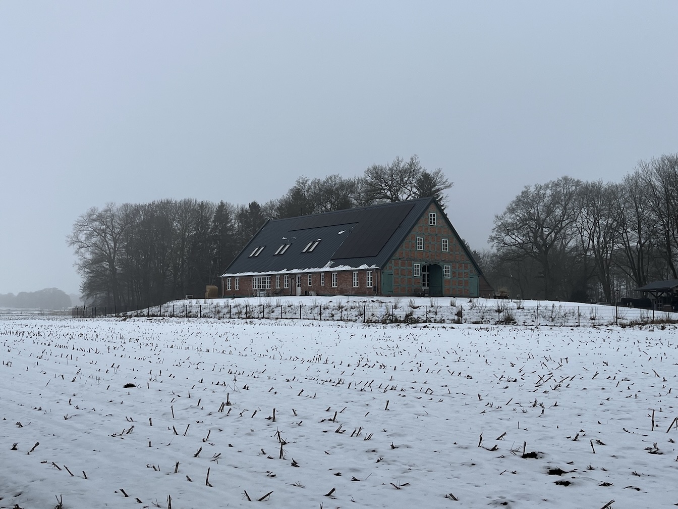 Anfang Februar sind wir nach Osterholz-Scharmbeck zu Expert Bening gefahren, übrigens eine echte Alternative zum MediaMarkt. Der Weg führte uns durchs St. Jürgensland. Dabei fiel uns dieses hübsche Bauernhaus auf der Warf auf, mit dem grünen Fachwerk und schön gegen den langsam schmelzenden Schnee abgesetzt. Das Foto ist vom 7. Februar 2026 und die Adresse von dem Haus ist Mittelbauer 13. Da kann man auch Ferienwohnungen mieten (https://mittelbauer.org/), wie meine Recherchen ergeben haben.