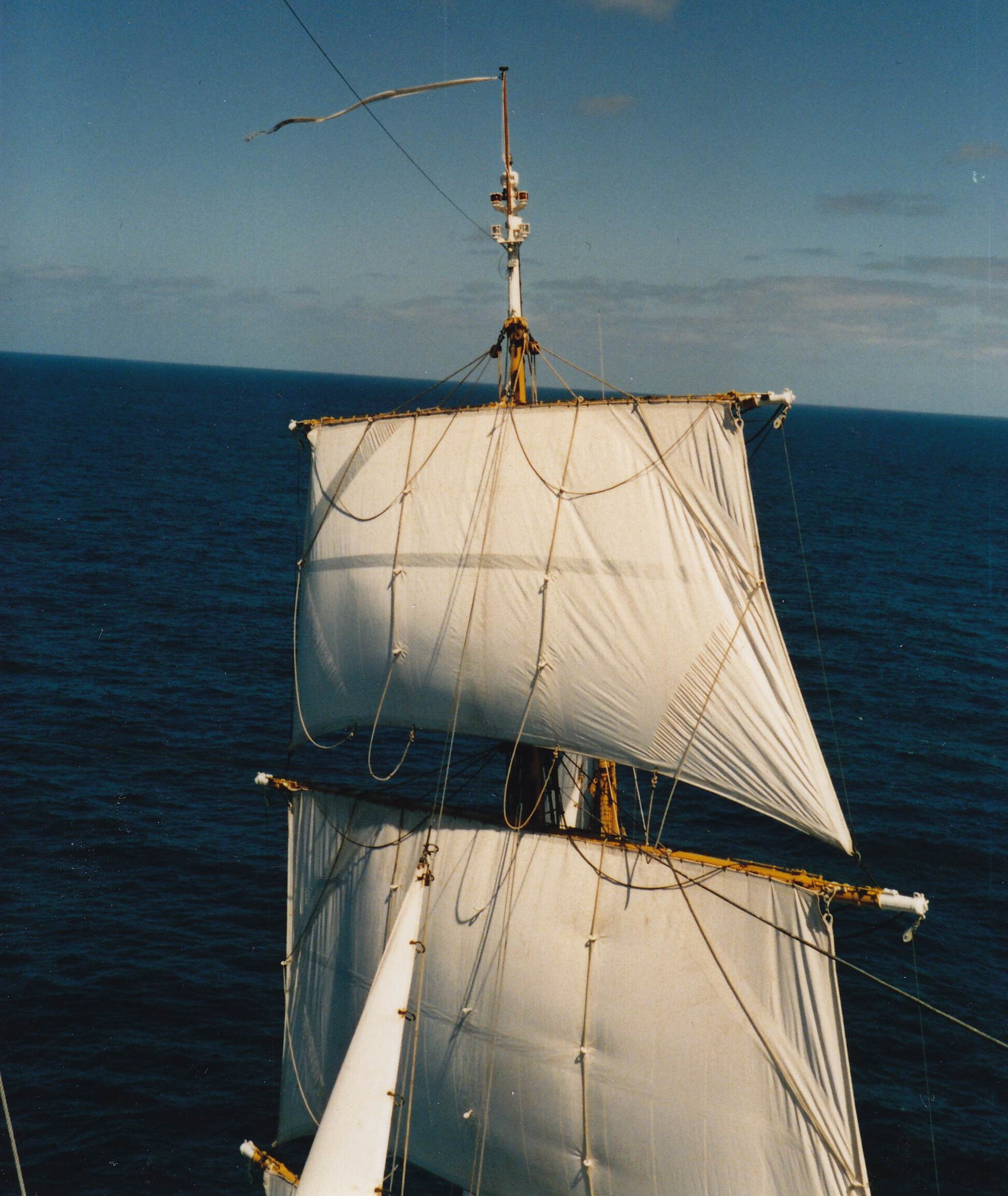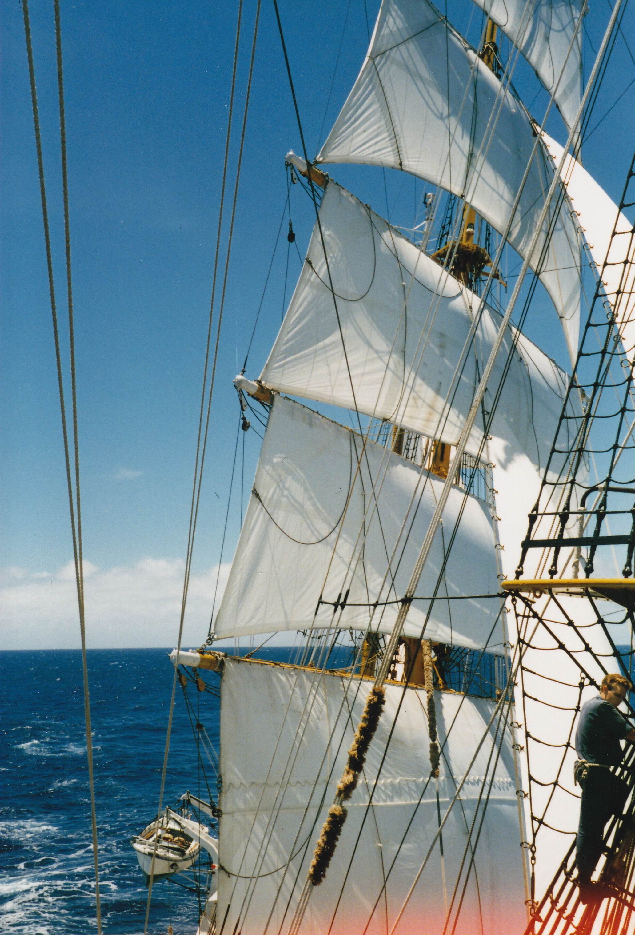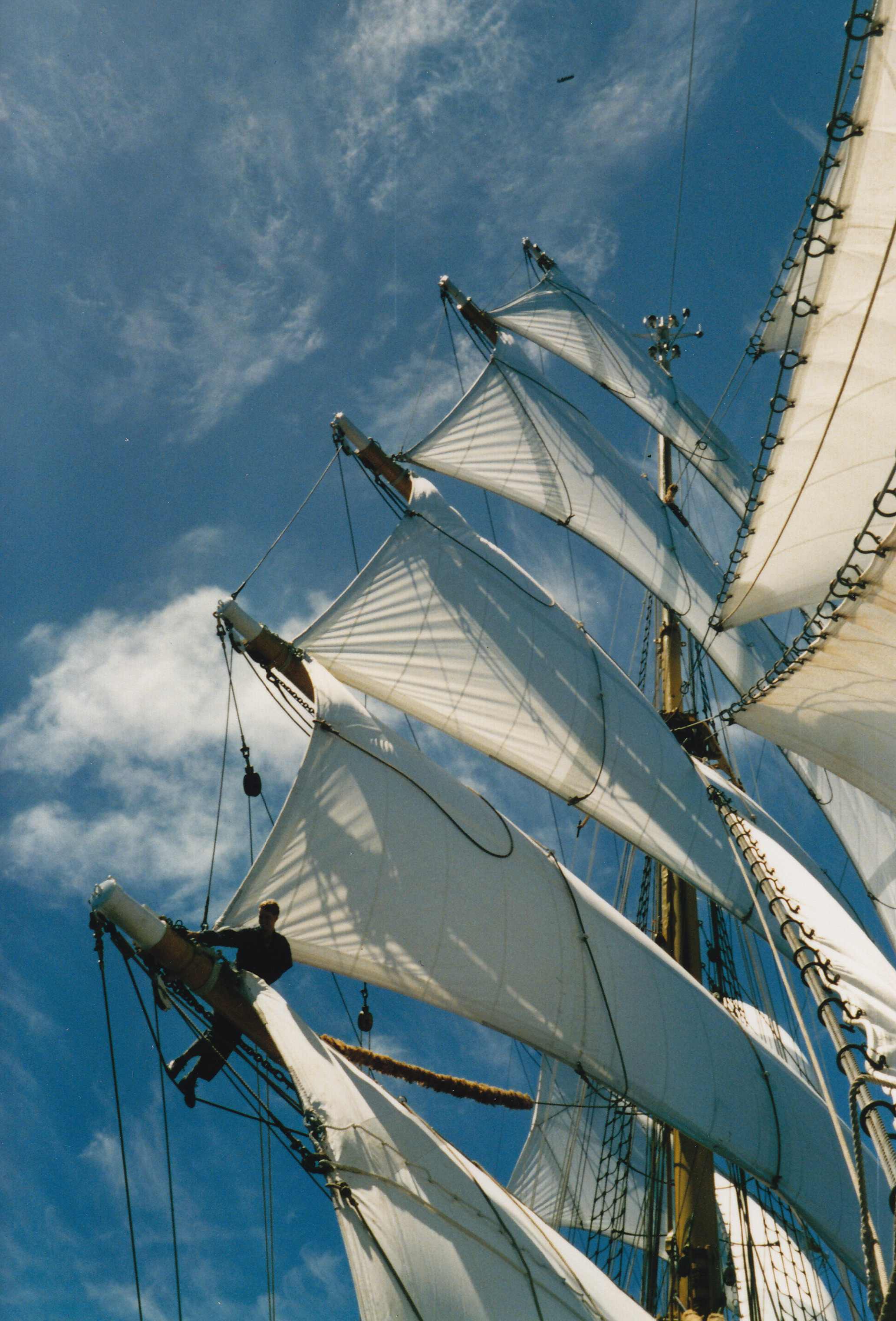 Auf diesem Foto sind die Segel des Fockmasts von unten zu sehen. Die Person im Blaumann, wahrscheinlich ich, ist auf der Rah des Focksegels. Meine Segelposition war sinngemäß genau dort, nur ein Mast weiter hinten, nämlich am Großmast und damit auf der Rah des Großsegels an Steuerbord.