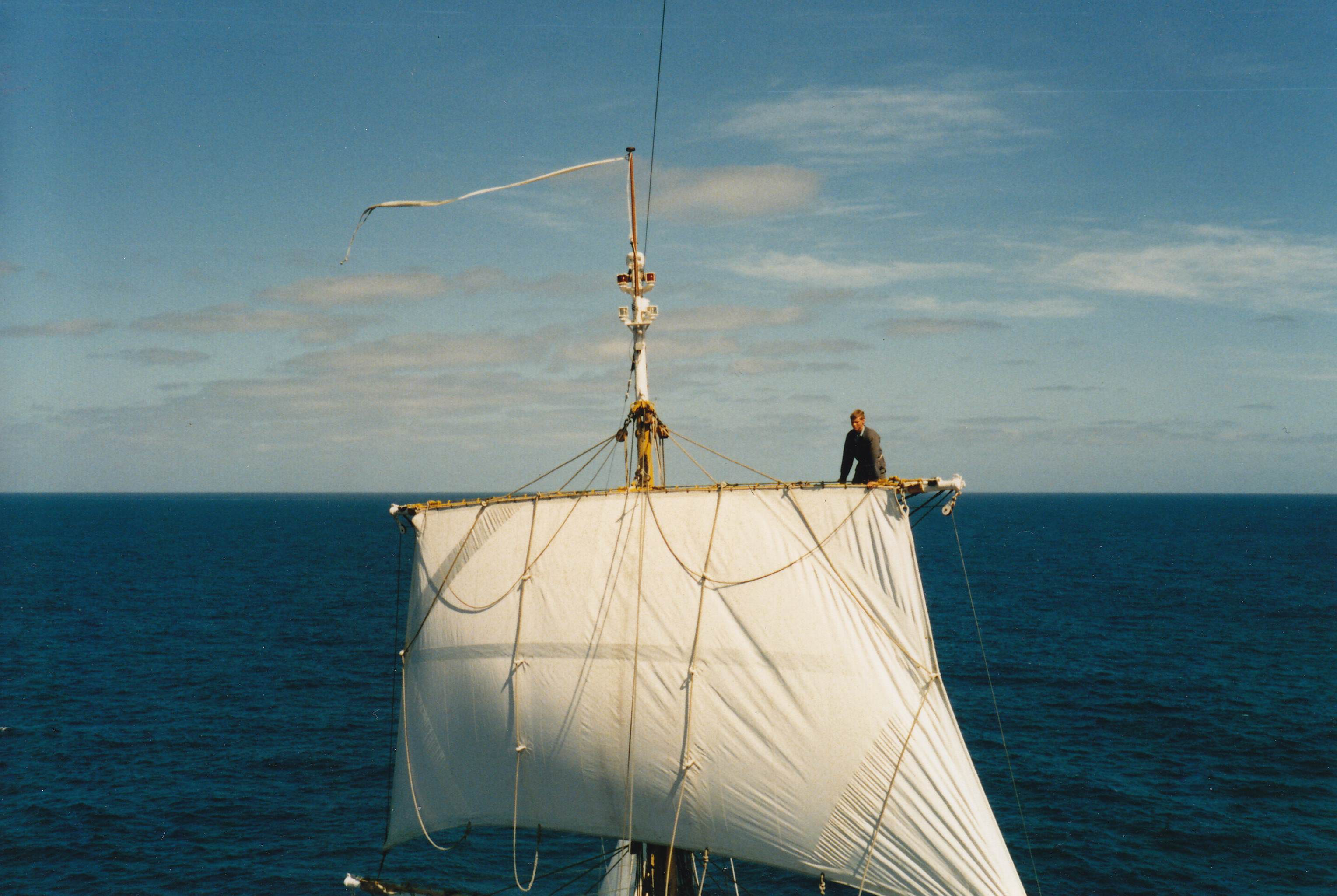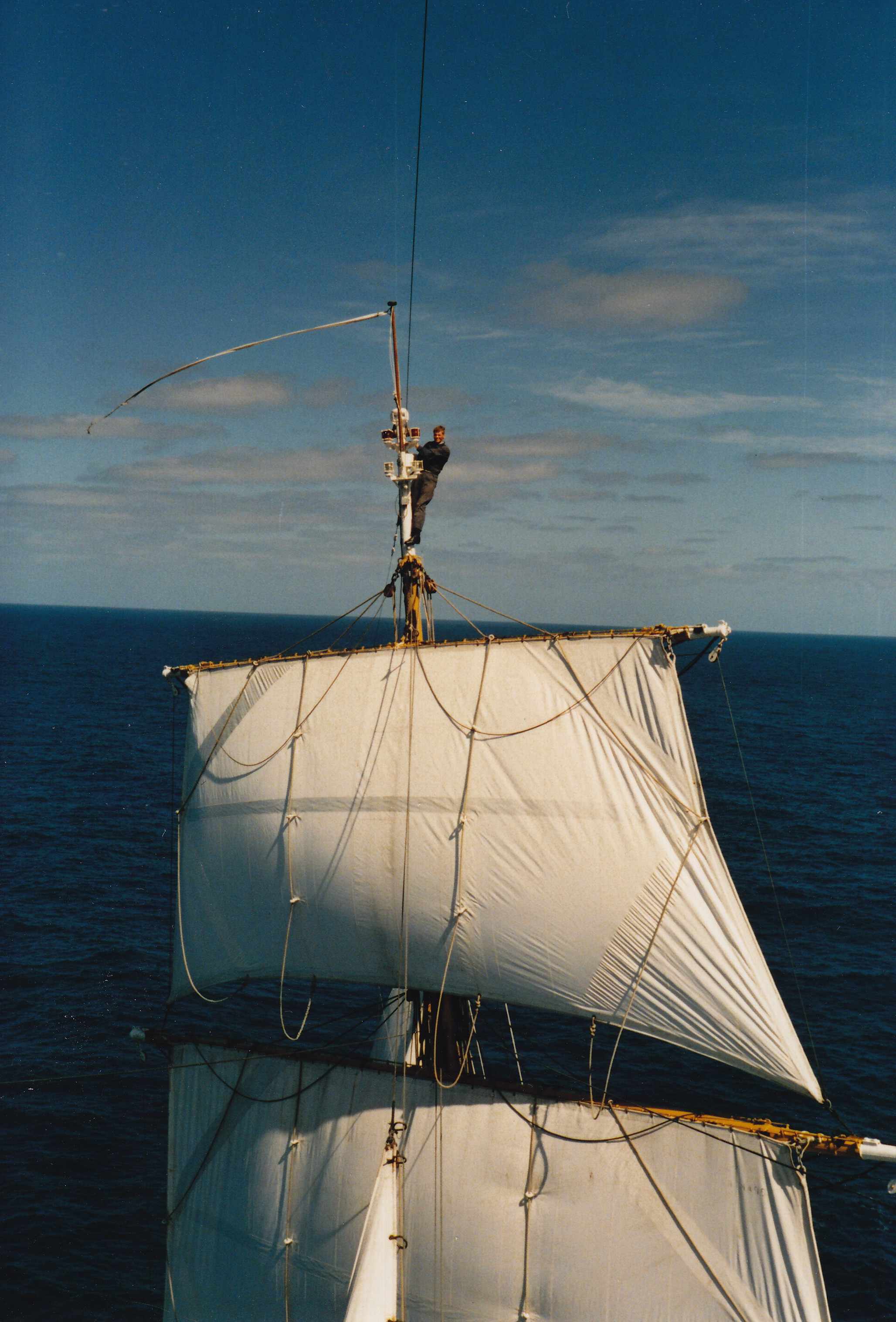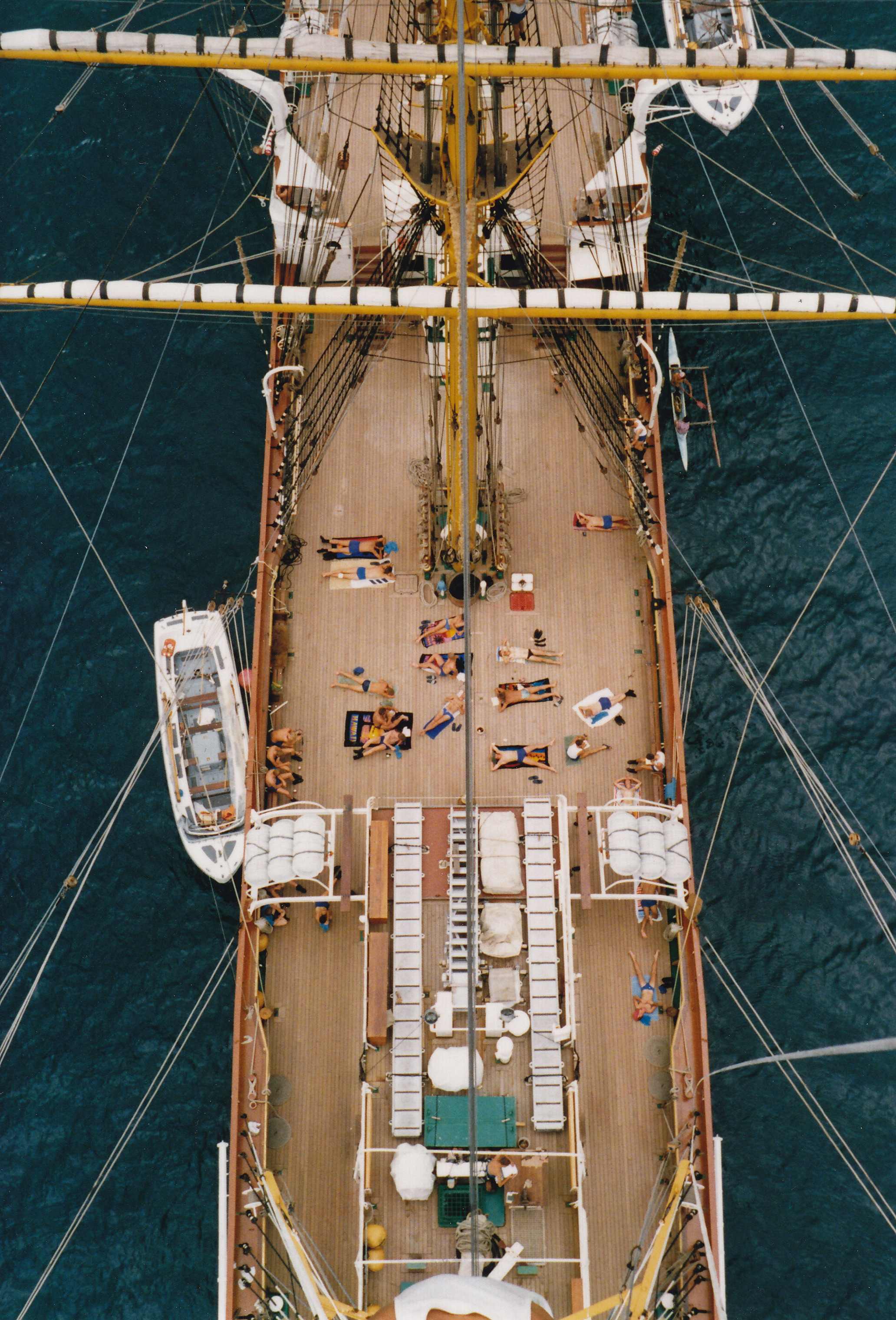 Ich habe es immer geliebt, die Masten hoch zu klettern, was in Fachsprache aufentern heißt. Manchmal musste man sogar bis zur Spitze des Großmasts klettern, um den Stander zu enttüdeln. Das sind da oben 45 m über der Wasserlinie.