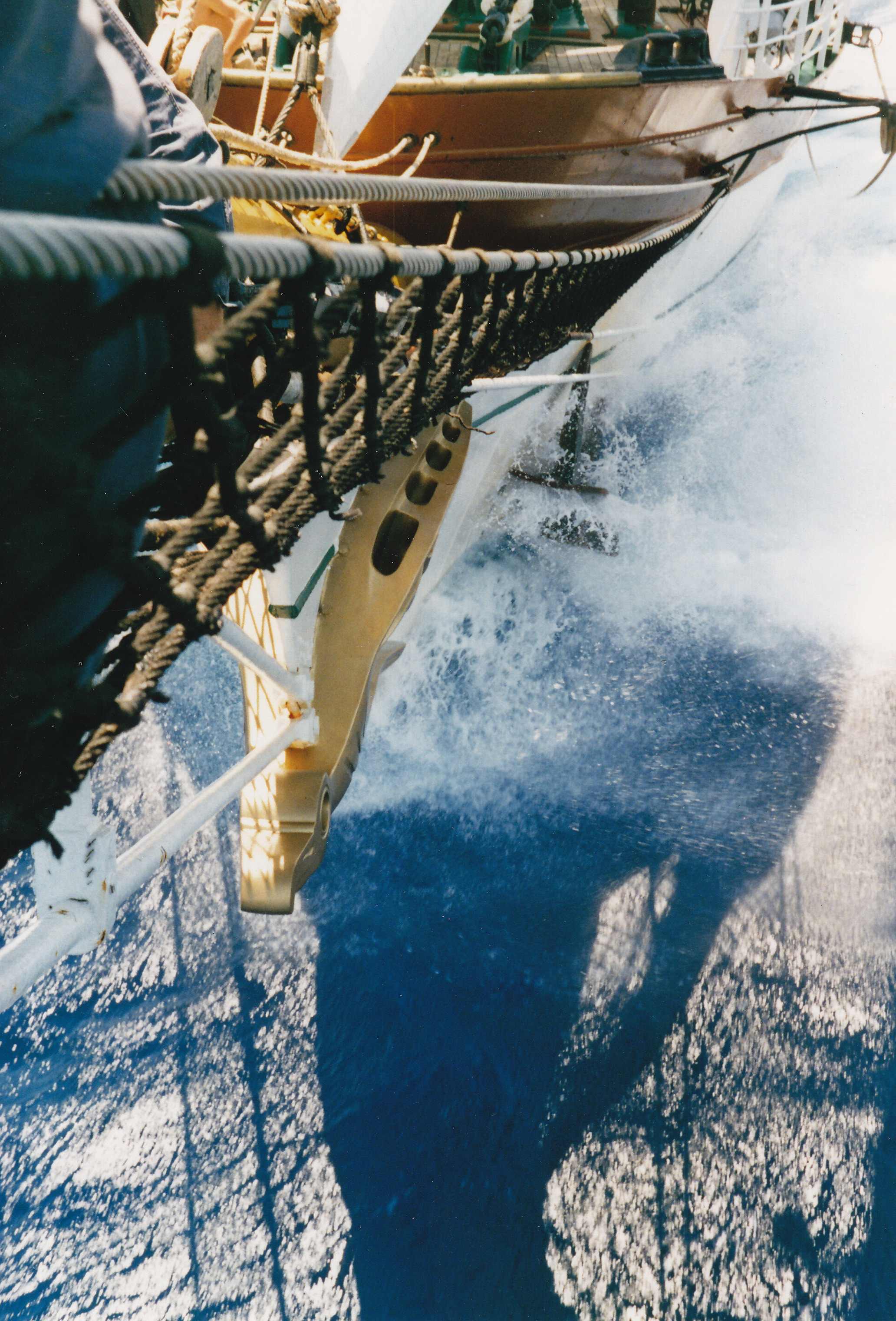Die beiden folgenden Fotos zeigen den Bug der Gorch Fock im Seegang, genauer gesagt beim Stampfen. Am Anker kann man am Besten den Unterschied zwischen den beiden unterschiedlich tief eingetauchten Positionen erkennen.