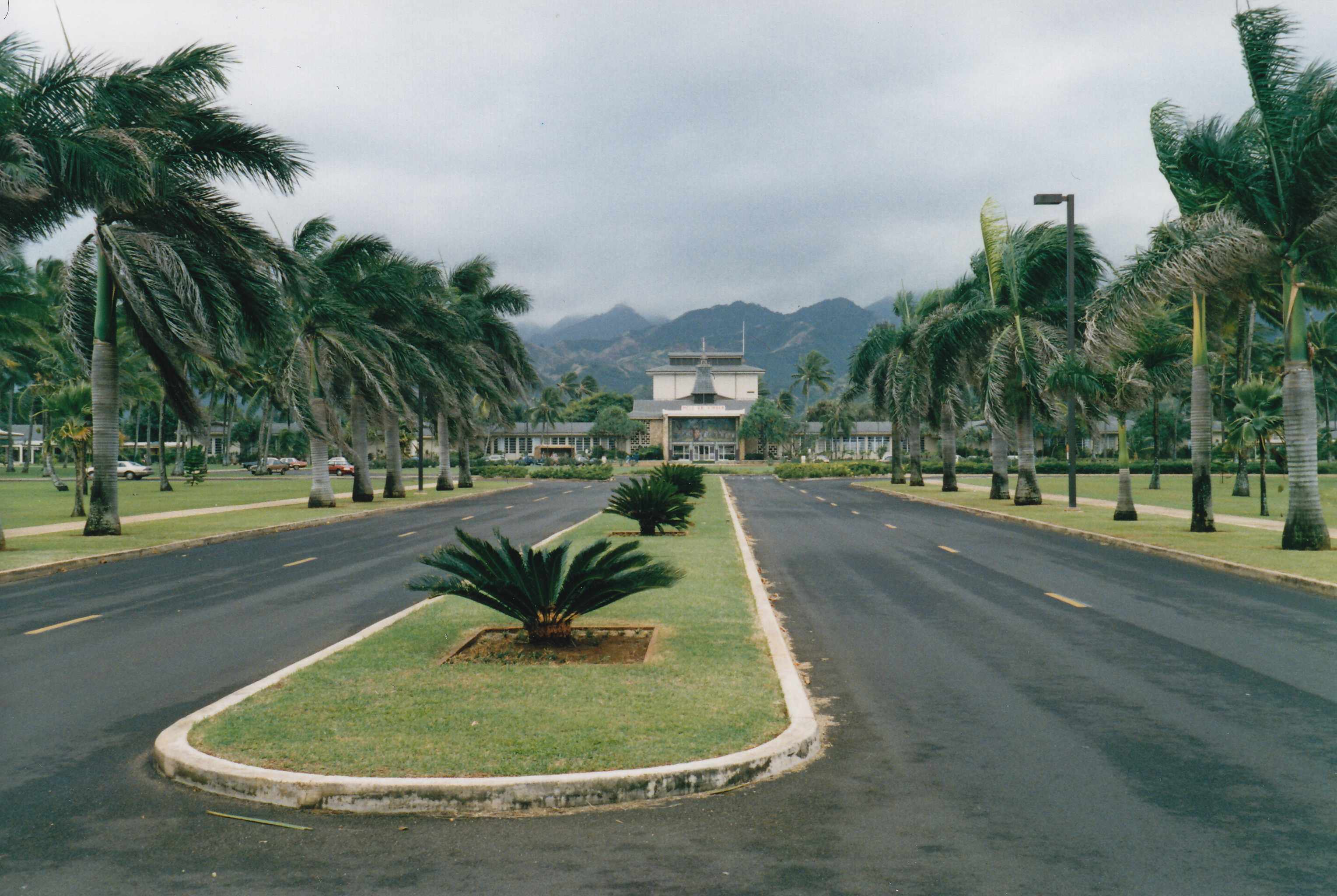 Hier ist die Hawaii Brigham Young University im Hintergrund zu sehen, irgendwie ein typisches Bild für Hawaii: Große amerikanische Straßen mit Südseevegetation.