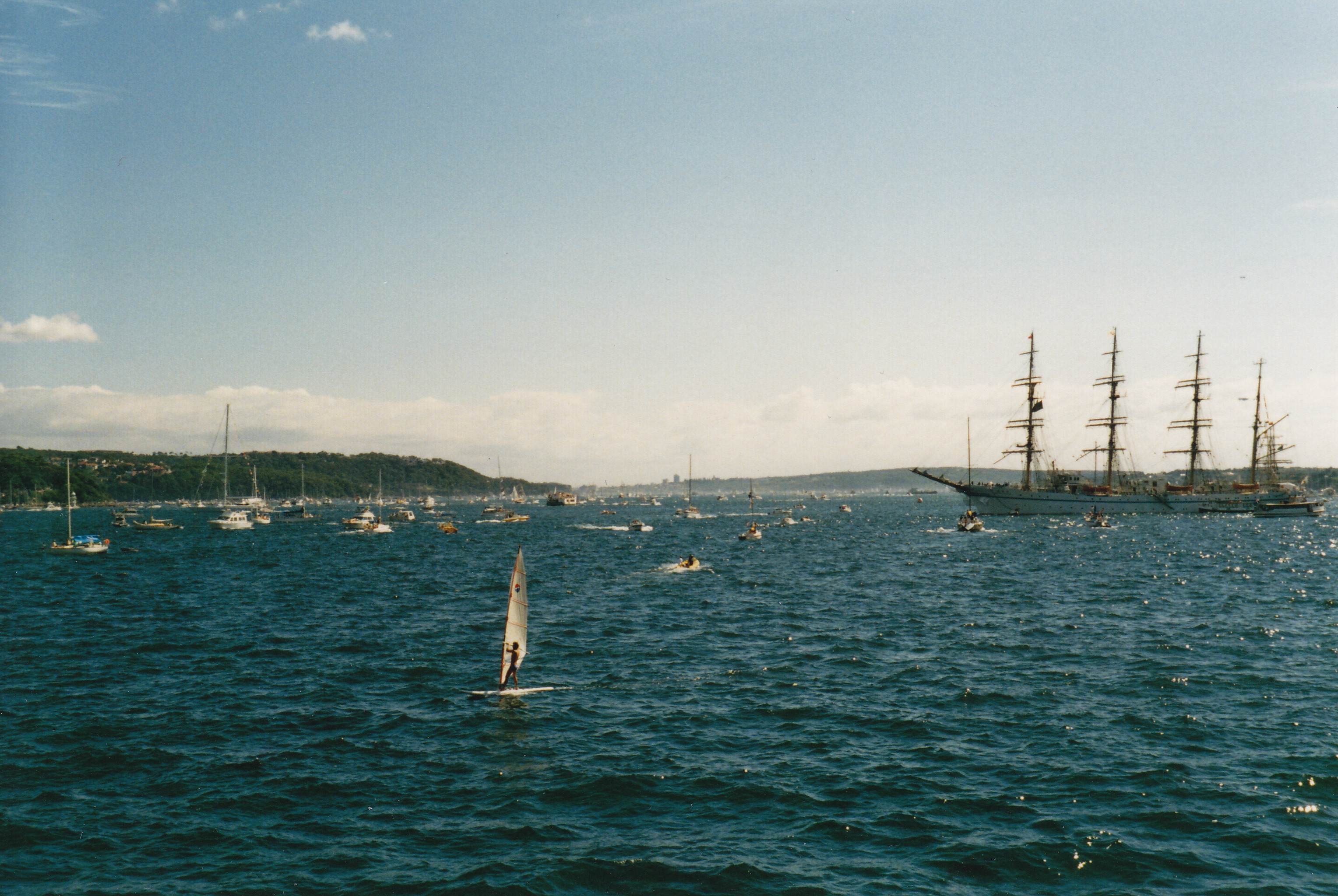Im Januar 1988 war also die Zweihundertjahrfeier (Bicentennial) und dazu sind einige Großsegler nach Sydney gekommen. Auf dem folgenden Bild dürfte die Nippon Maru, die Japanische Viermastbark, im Hintergrund zu sehen sein.