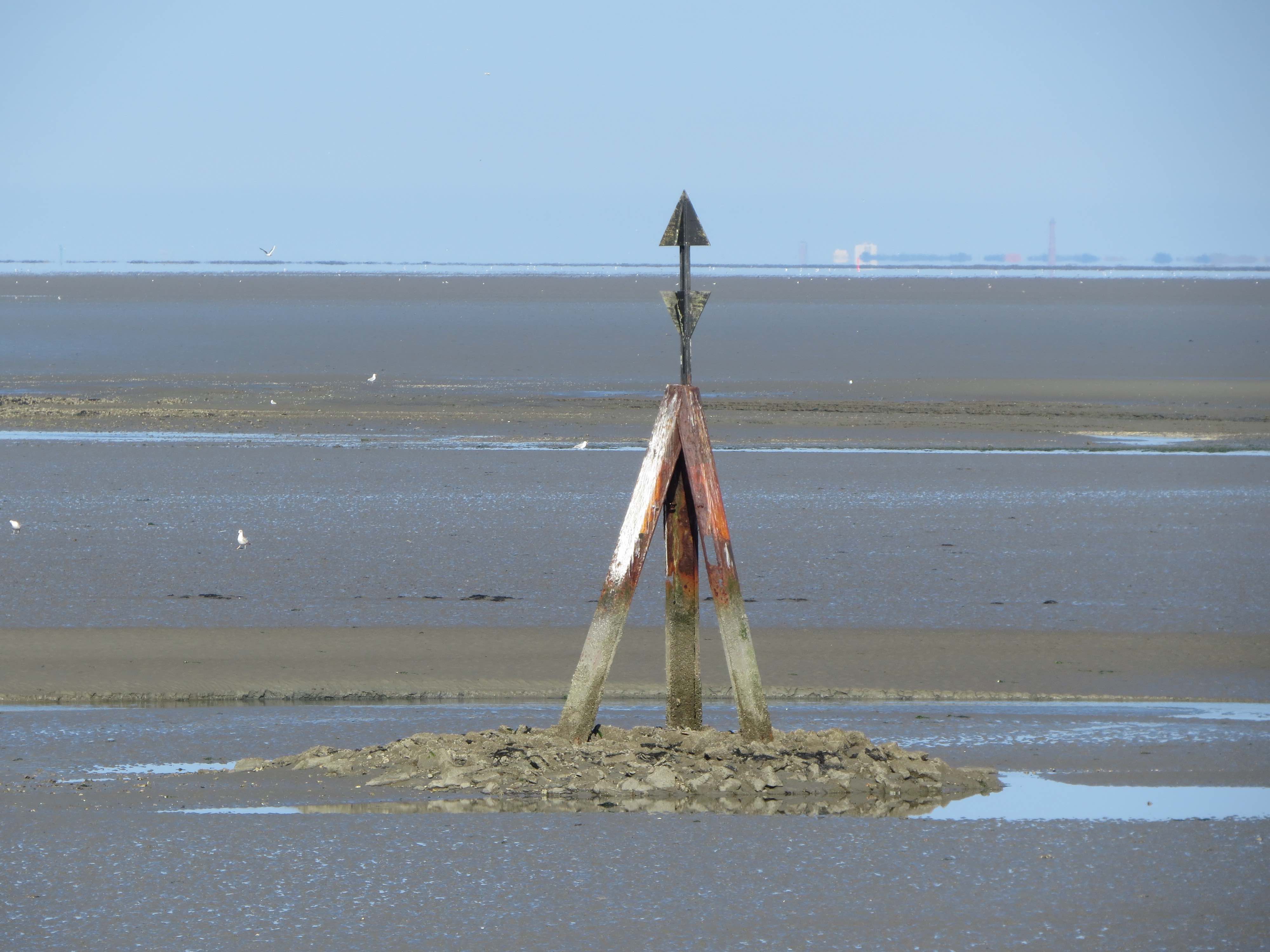 Bei Niedrigwasser werden die Untiefen sichtbar, um die man bei Hochwasser durch all die Seezeichen geleitet wird, wie z.B. durch dieses östliche Untiefenzeichen, das östlich der Untiefe aufgestellt ist, vor der es warnen soll.