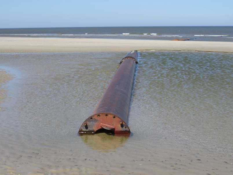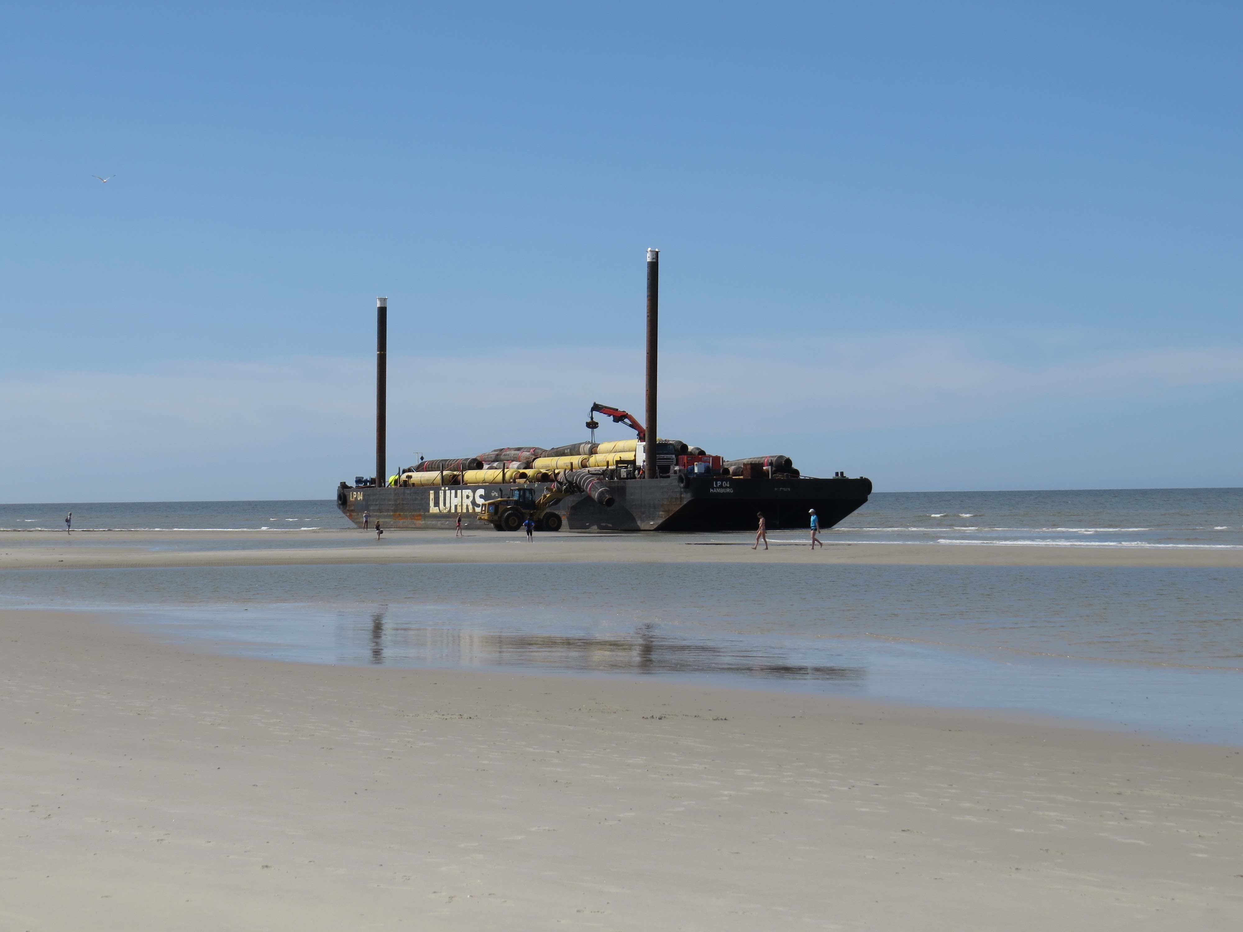 Heutzutage pumpt man gelegentlich Sand von Stellen, wo er sich ablagert, hierher. Das war z.B. im Sommer 2013 der Fall. Da wurde der Sand, glaube ich, aus dem Bereich der Fahrrinne zwischen Langeoog und Baltrum genommen, also dem Accumer Ee. Dafür wurden Rohre verlegt…