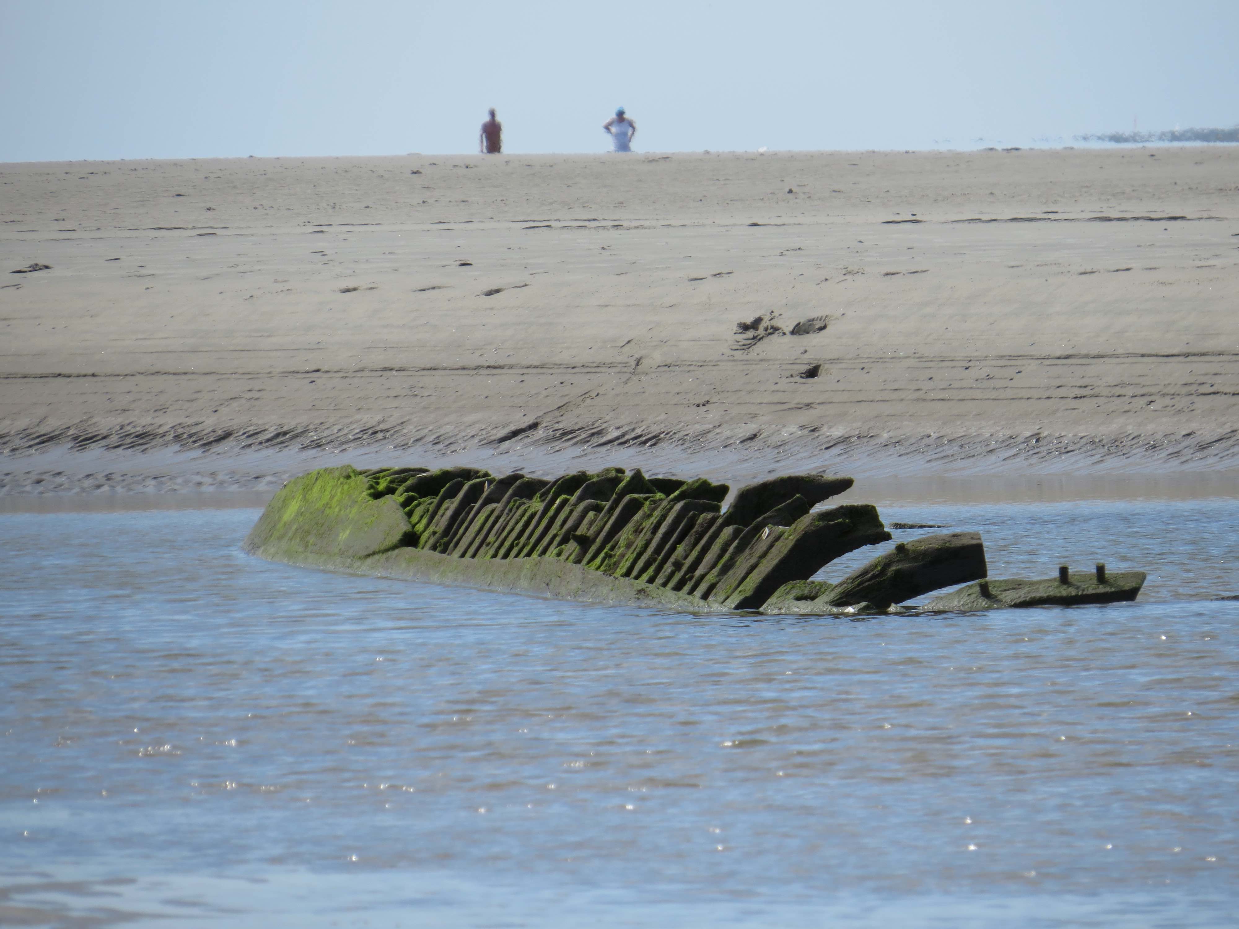 …und das nötige Material zum Verlegen hat dieses Schiff gebracht, das sich bei ablaufendem Wasser auf dem Strand trockenfallen lassen kann.