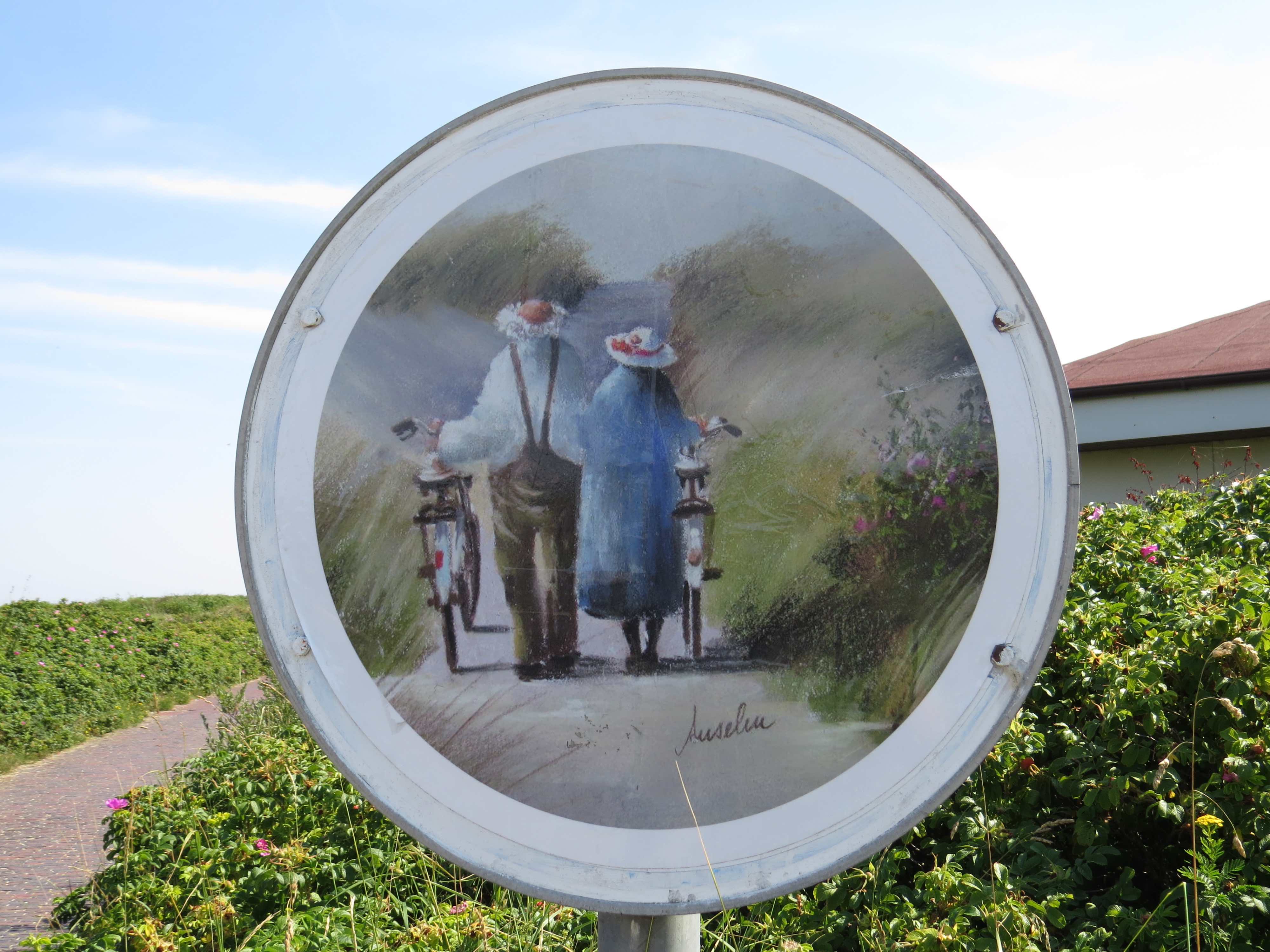 Dieses passende Gemälde ist wie ein Verkehrsschild aufgestellt, an der Höhenpromenade, wie der Weg durch die Dünen dort genannt wird. Die Höhenpromenade verläuft an ein paar Aussichtspunkten vorbei, die einige Blicke auf das Meer und den Ort gewähren, und führt dann weiter zum Pirolatal.
