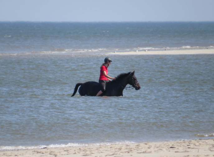 Auch Reiter durchqueren gerne den Wasserarm, der einen solchen Sandstreifen vom Strand abtrennt.