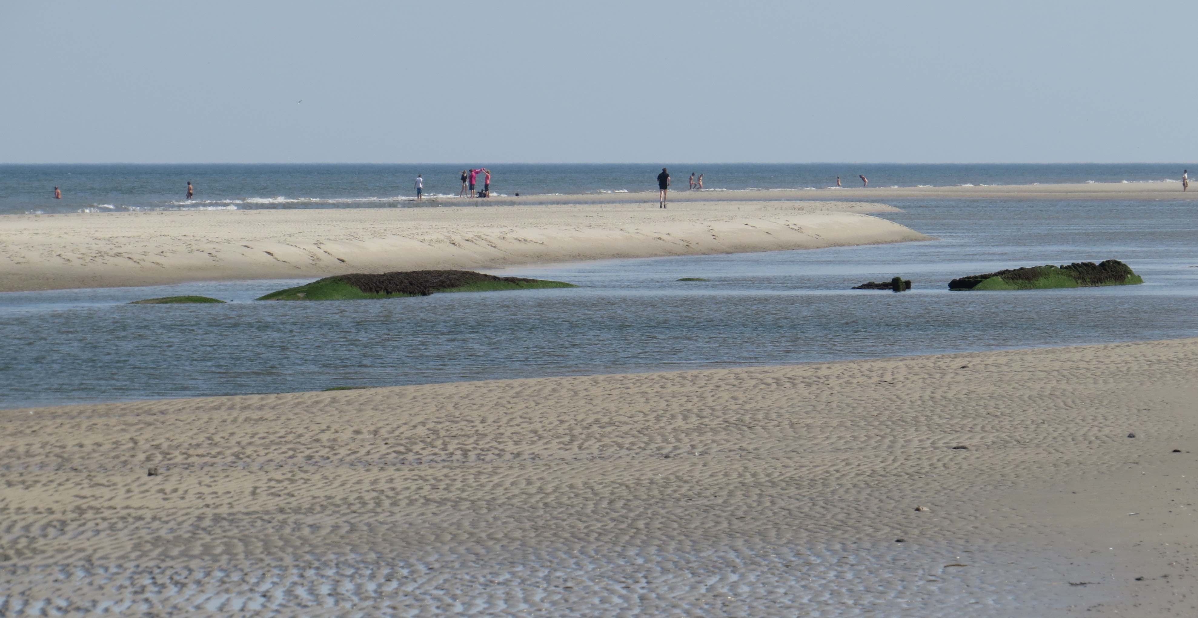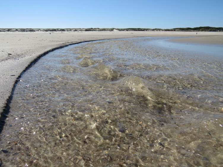Jedenfalls führt am Einlass des Inlets Ebbe und Flut zu starken Strömungen. Am Ende des Inlets, wo die Sandbank auf den Strand trifft, ist die Strömung aber schwach, sodass sich Schlick bilden kann, also Boden wie im Watt. Da kann man hüfttief einsinken und mitunter ohne Hilfe nicht wieder herauskommen.