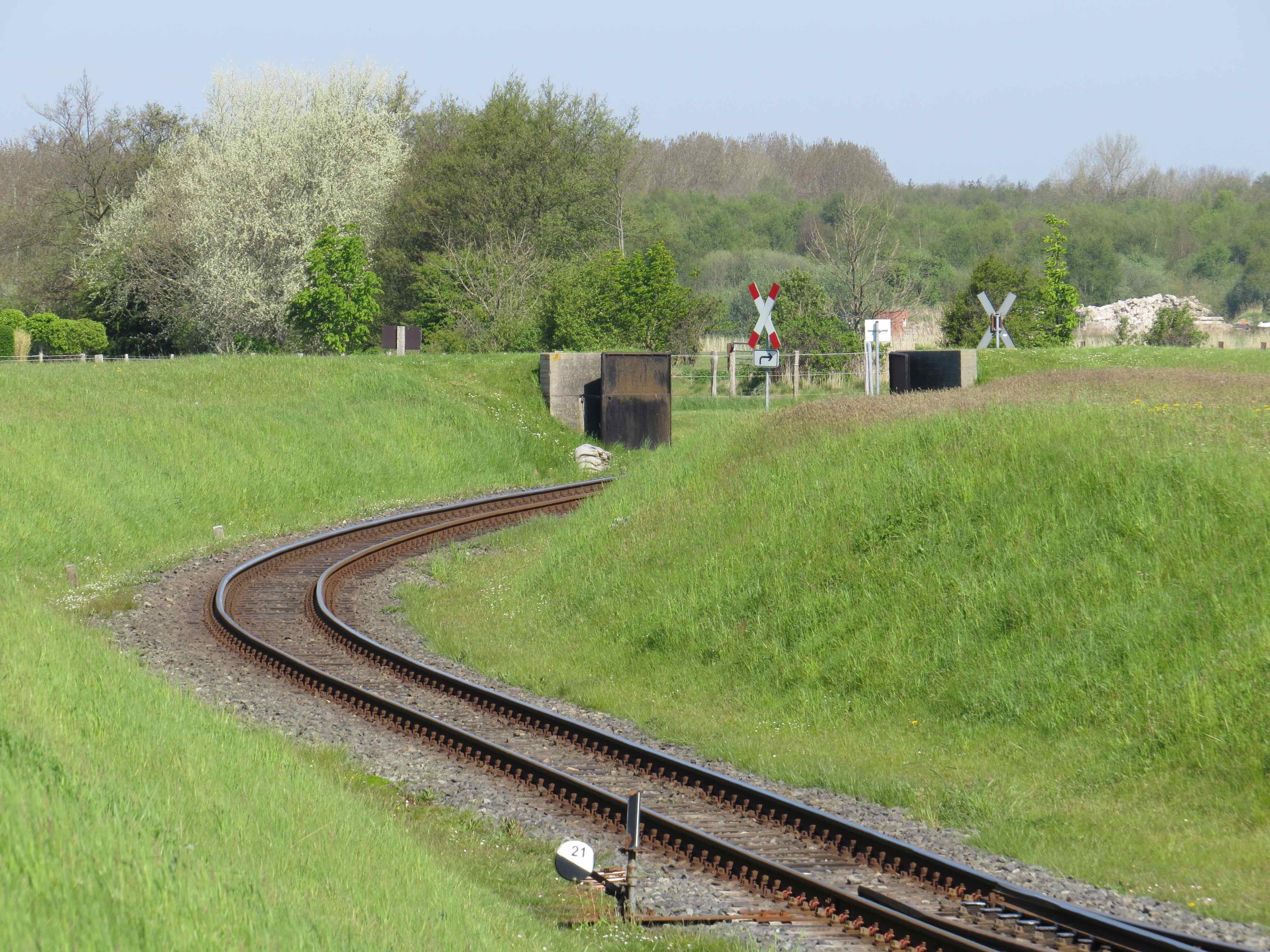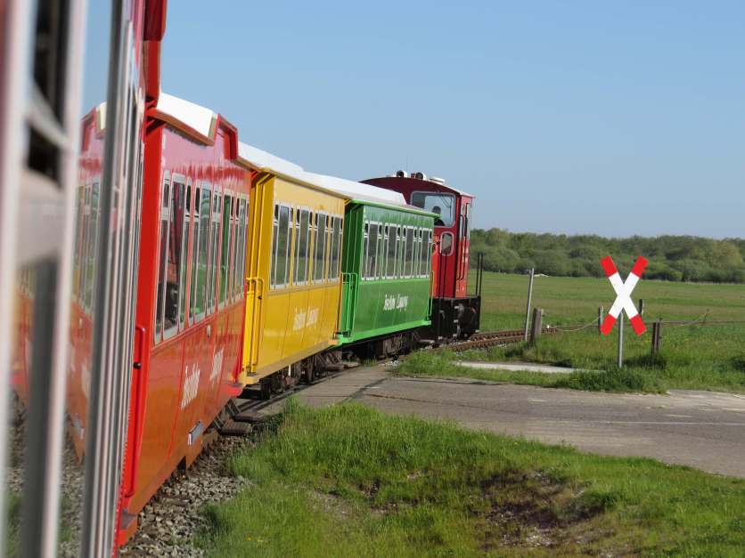 Jetzt soll es aber endlich losgehen, nämlich erstmal vom Hafen mit der Inselbahn. Dazu geht die Strecke durch einen verschließbaren Durchgang im Deich.