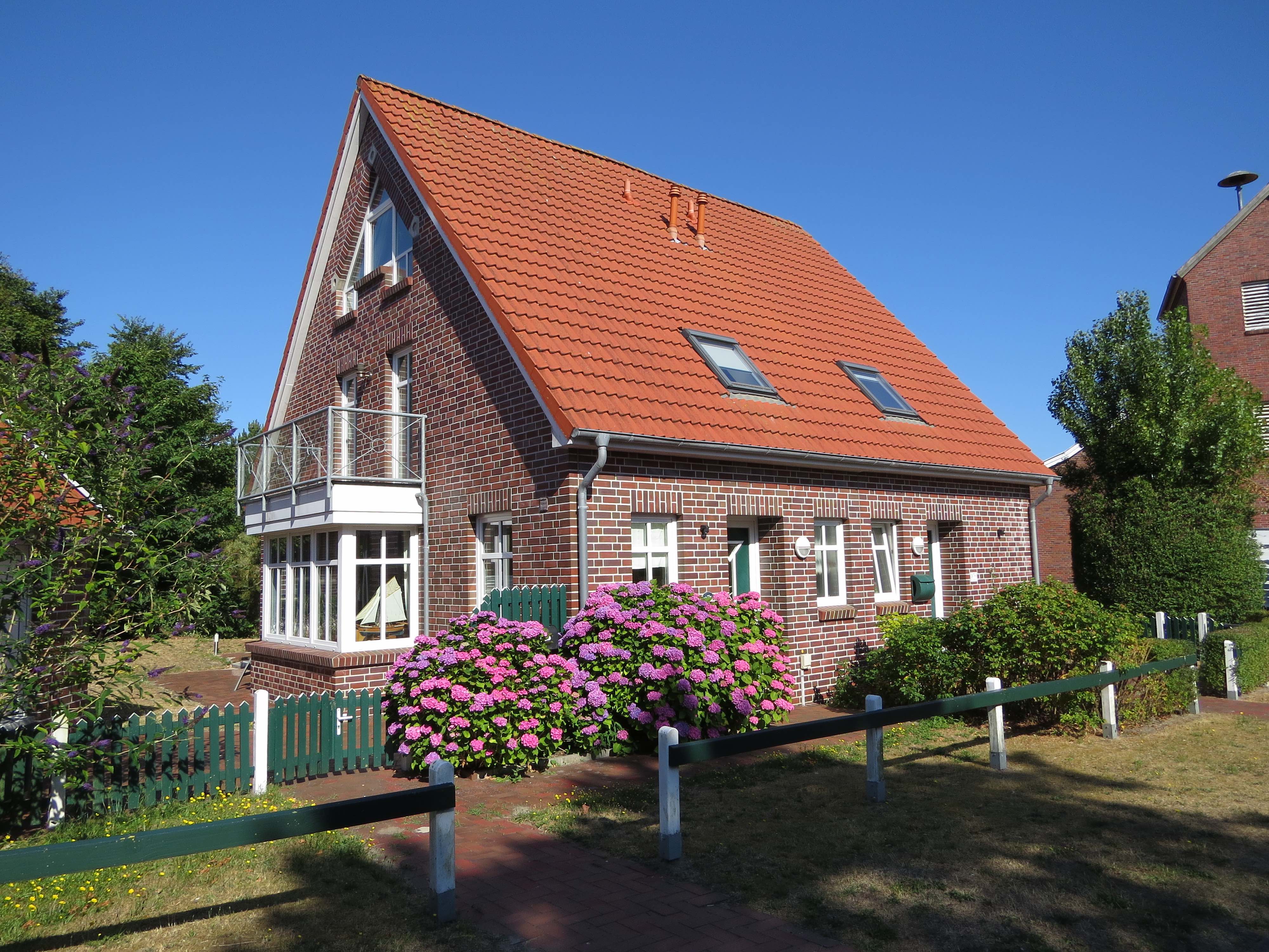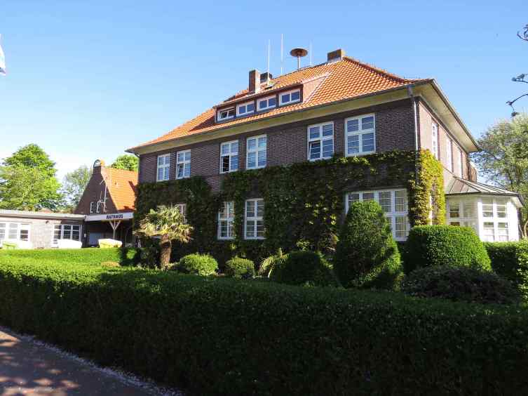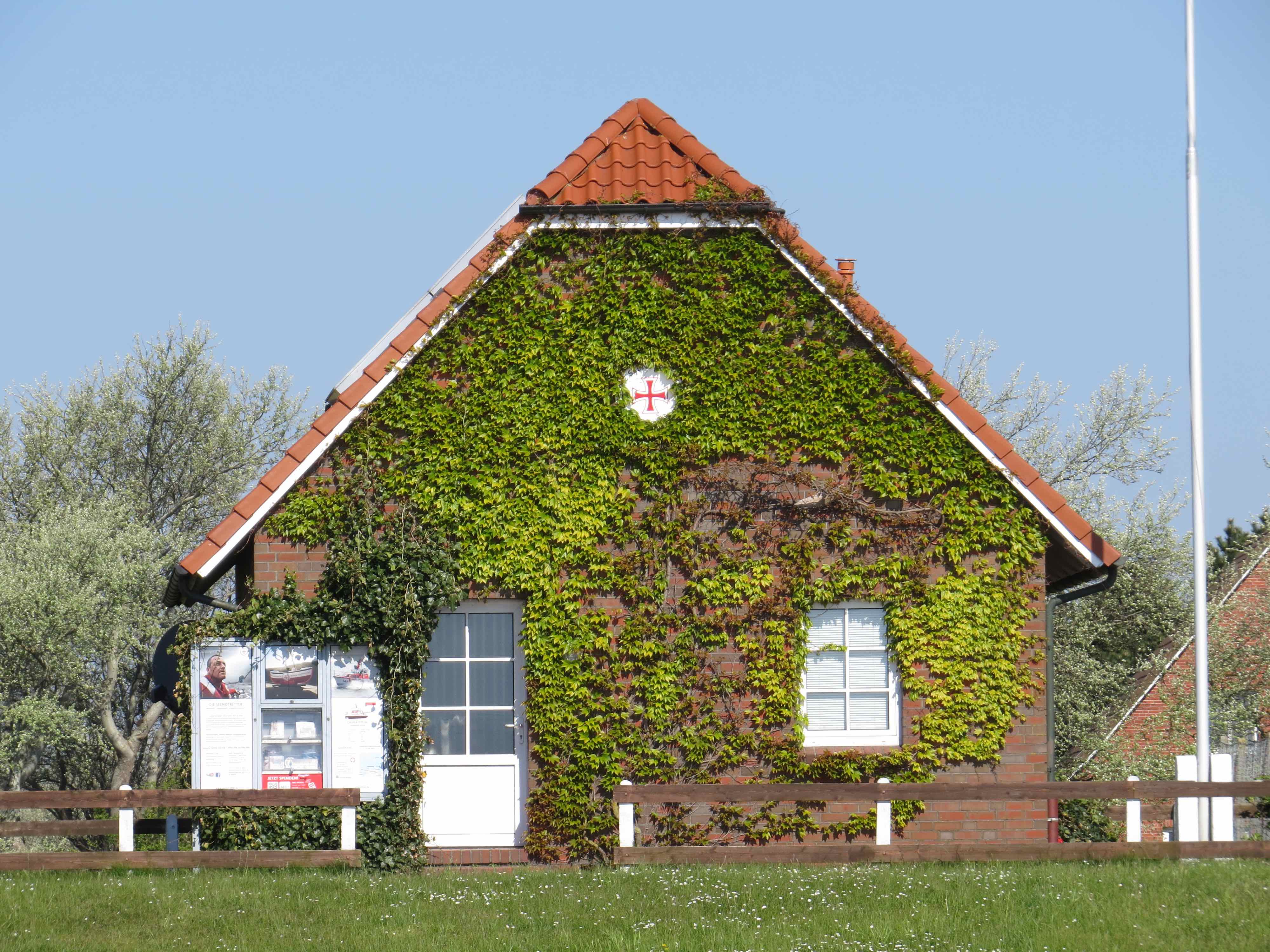 Hübsch in Efeu eingewachsen, aber Tür, Fenster und Emblem sind freigeschnitten. Typisch für Langeoog ist auch die Art des Zaunes: Weiße Pfosten mit einer oder zwei Reihen Brettern. Anders als auf diesem Foto sind die Bretter häufig grün gestrichen