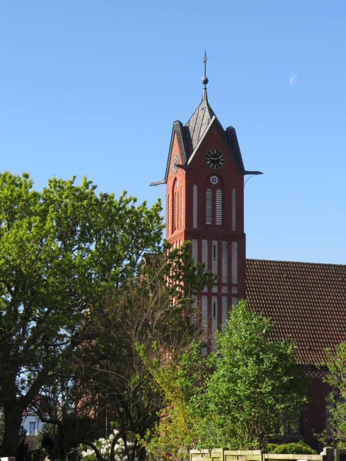Und so sieht der evangelische Kirchturm aus (morgens um zehn nach Neun mit Mond).