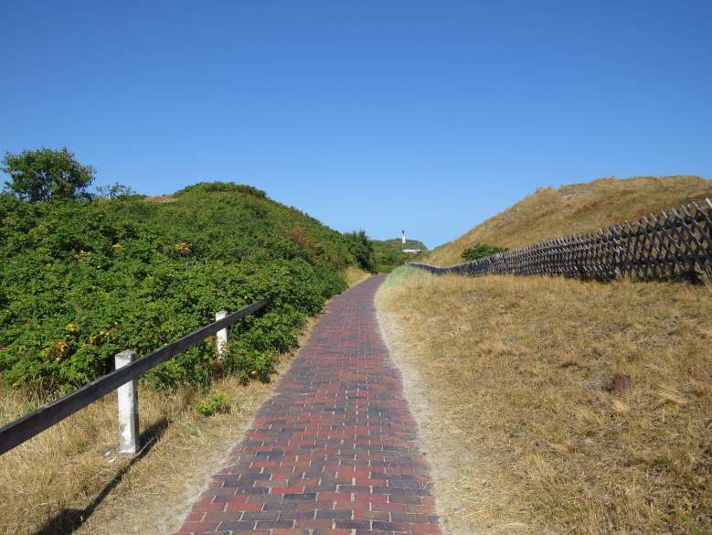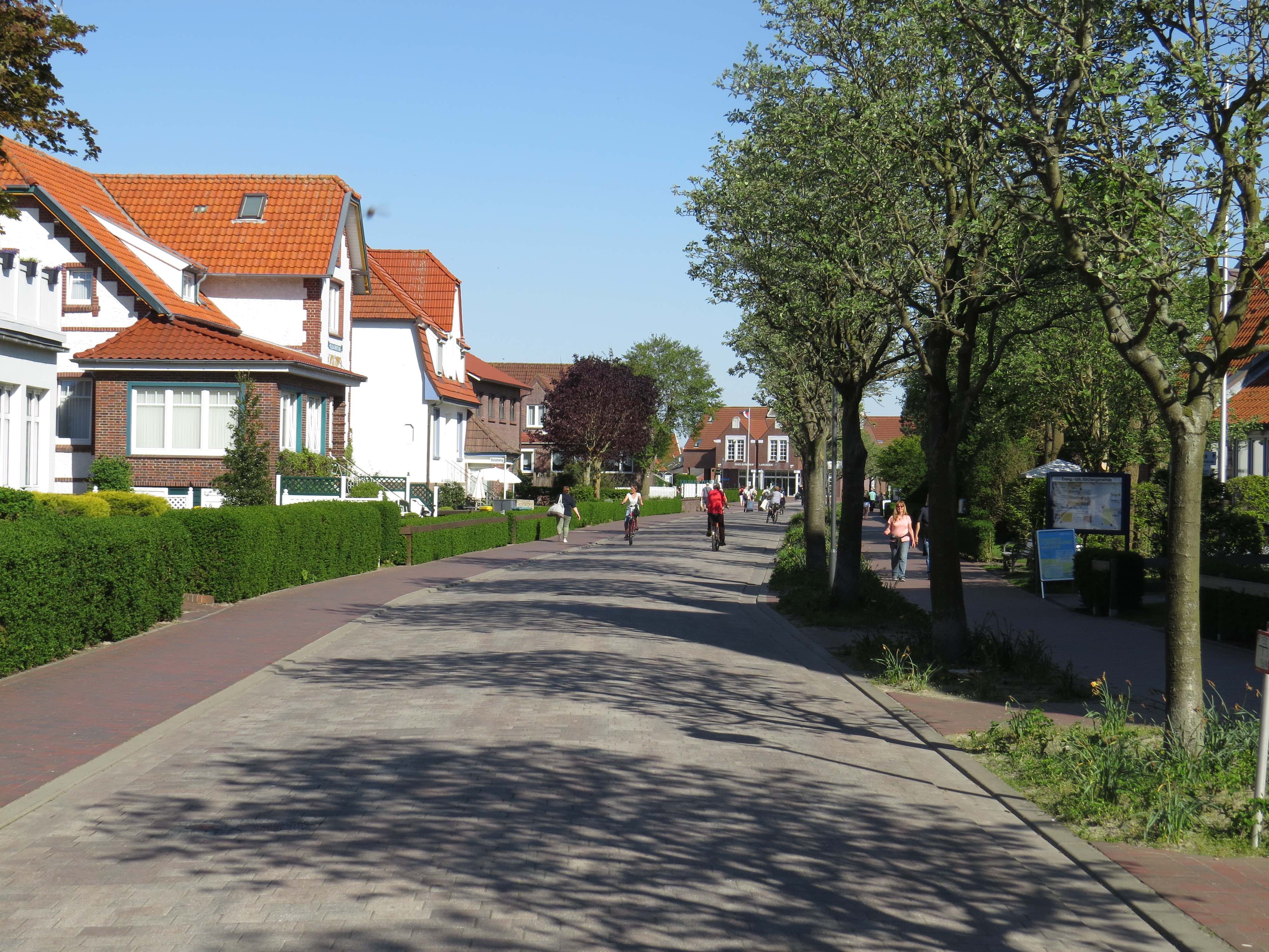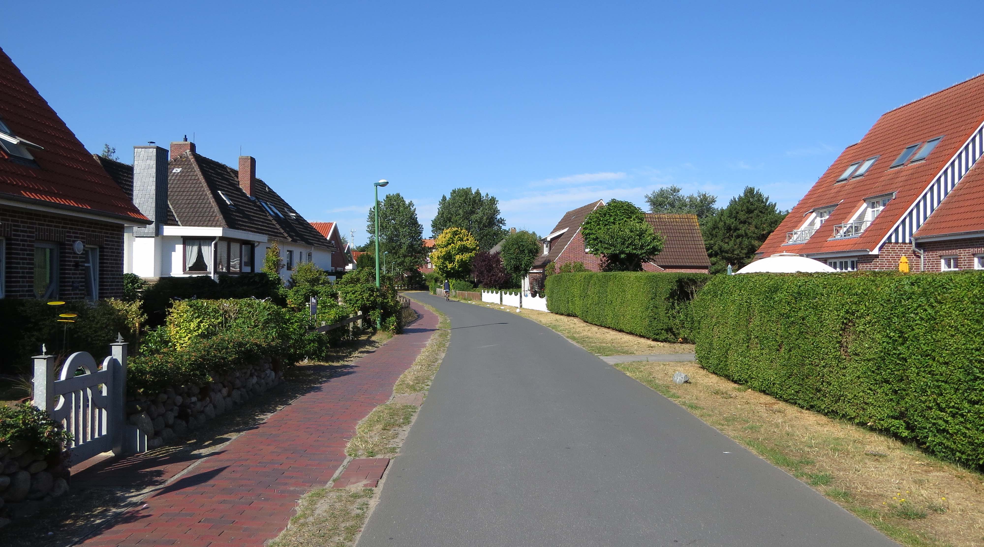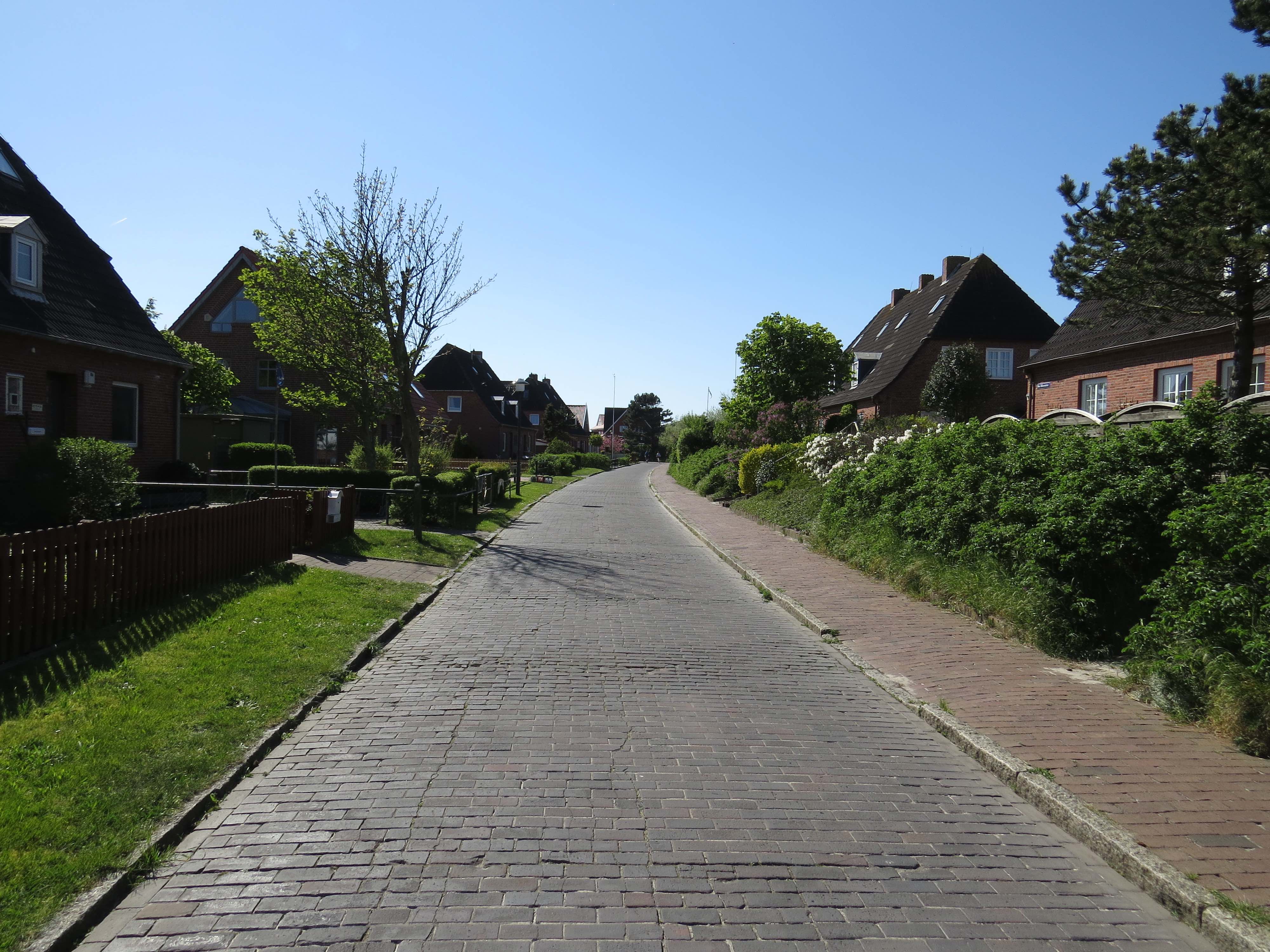 Einen solchen roten Klinkerfußweg auf einer Seite der Straße zu haben, ist recht typisch für Langeoog.