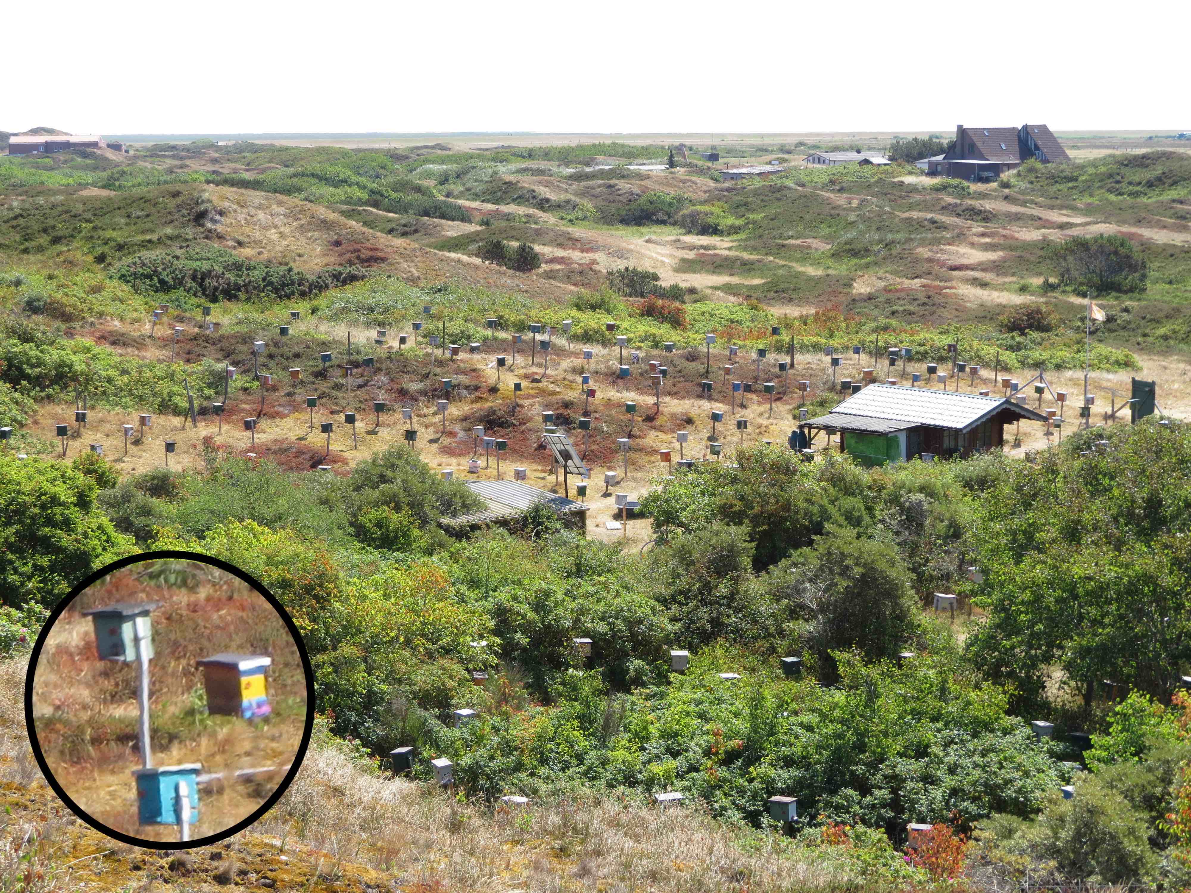 Unterhalb der ehemaligen Seenotbeobachtungsstation ist diese Ansammlung von bunten Kästen zu sehen. Dabei handelt es sich um die Bienenbelegestelle, im Klartext: Bienenzucht. In jedem bunten Kasten ist somit eine jungfräuliche Bienenkönigin mit kleinem Hofstaat. Weiteres dazu kann man auf Wikipedia nachlesen (Belegstelle) und hier geht es zur Belegstelle Langeoog.
