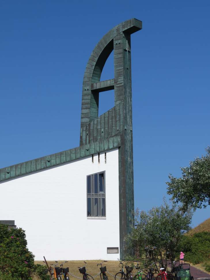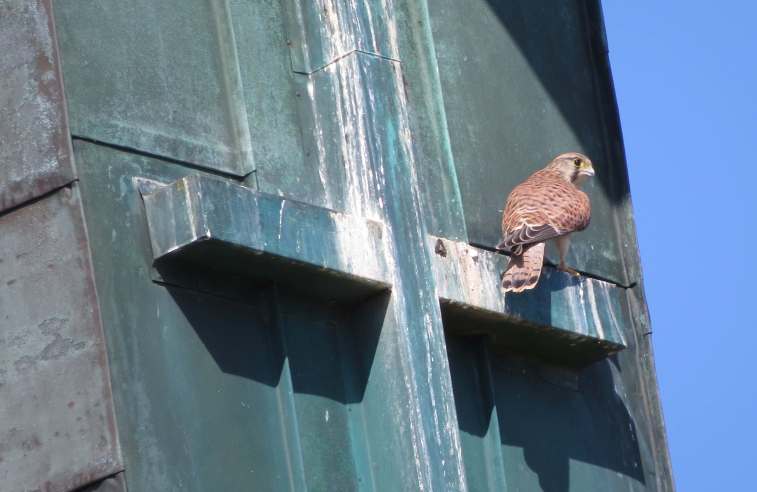 Der Turm soll an einen nach oben ragenden Schiffsbug erinnern. Für mich sieht das eher wie ein Schlitten aus. Bei näherem Hinsehen erkennt man, dass oben — vielleicht nicht überraschend — ein Kreuz angebracht ist. Es ist sehr unscheinbar, aber dem Turmfalken scheint es zu gefallen.