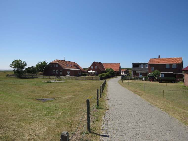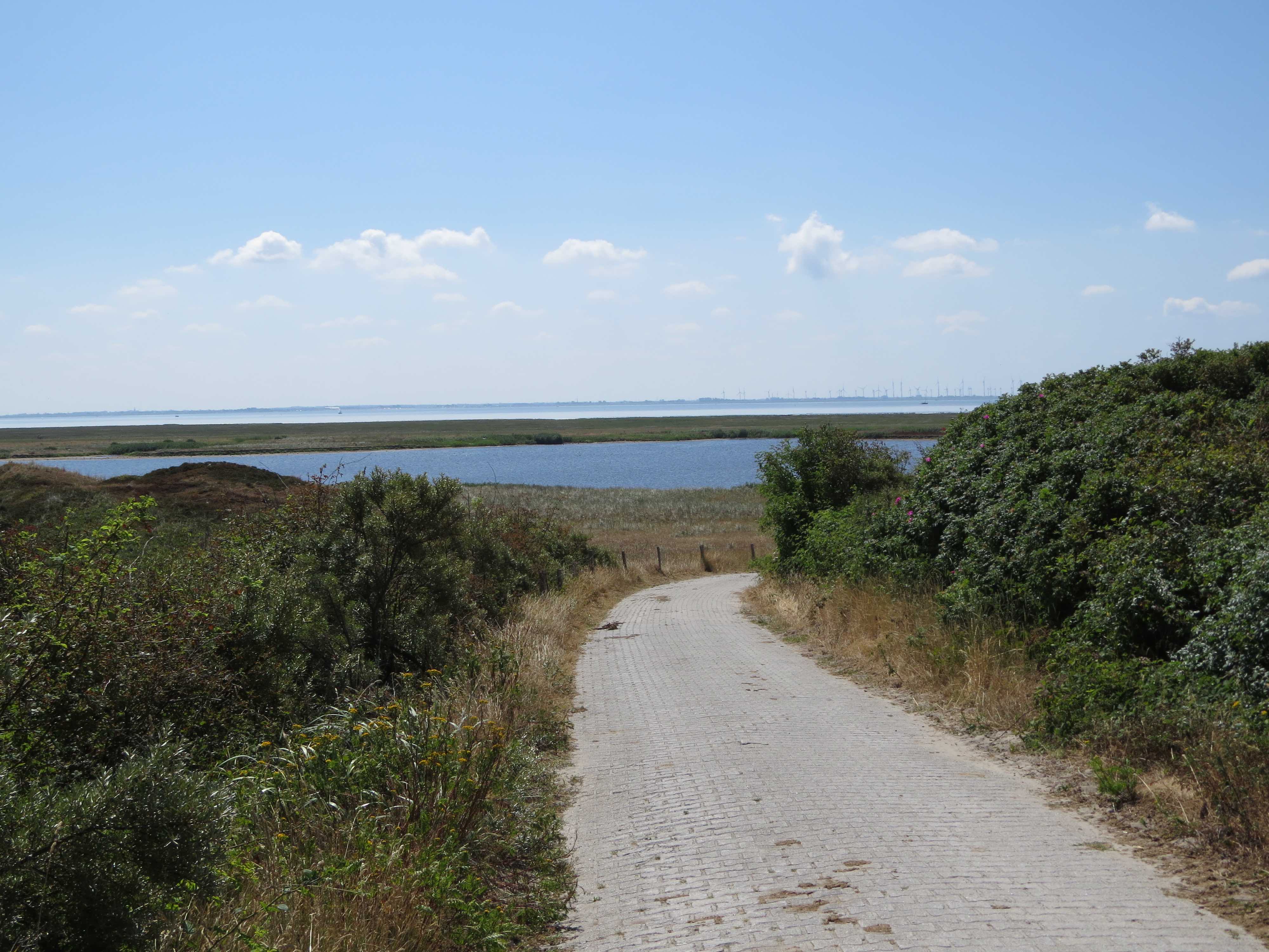 Das ist dann direkt hinter dem Deich, der bis zum Hafen führt. Der Deich war schon immer, jedenfalls so lange ich mich daran erinnern kann, riesig und hier traut man anscheinend nicht den Dünen. Schließlich sind wir hier am Westende und das scheint auch bei anderen Inseln große Probleme bei Sturmfluten zu bereiten. Auf Spiekeroog gibt es an der Westspitze sogar einen Steinwall und etwas weiter ist vor ein paar Jahren einiges der Dünen am Rande zum Campingplatz weggespült worden.