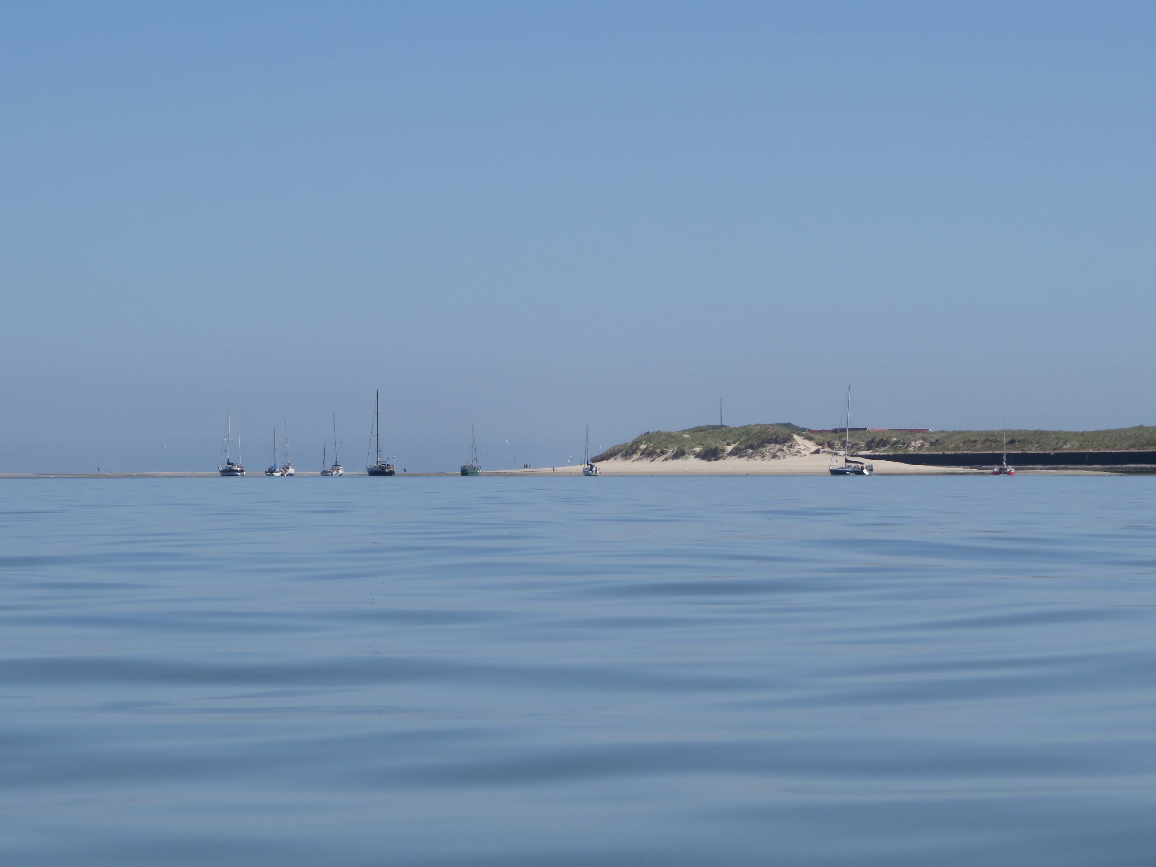 Wenn man von Neuharlingersiel startet, kommt man am Westende von Spiekeroog vorbei, mit Blick auf einige ankernde Boote.