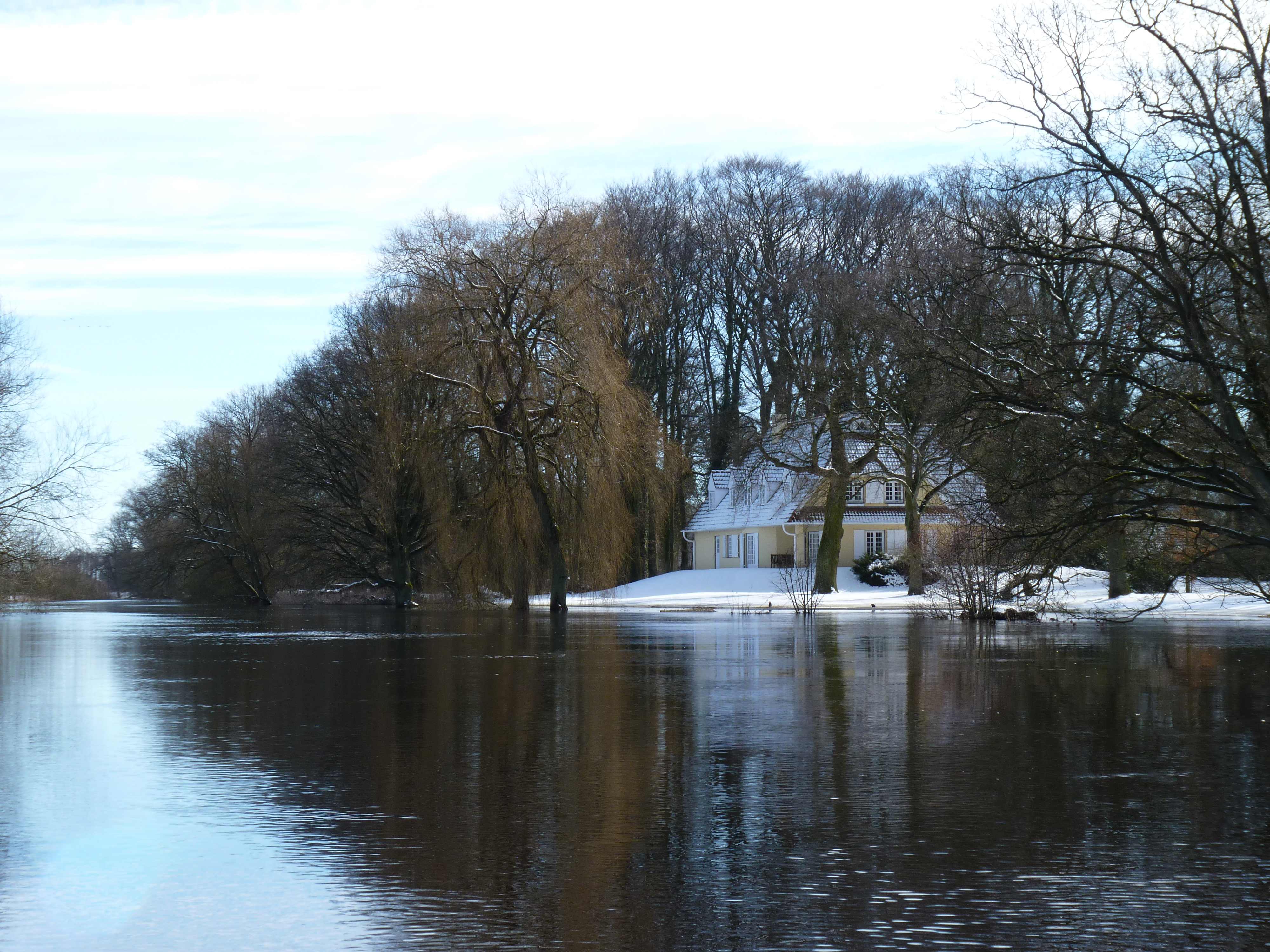 Ein Blick von der Wümme, vom Kajak aus, auf ein teilweise überschwemmtes Bremen-Borgfelder Grundstück. Das Winterhochwasser auf der Wümme kann bis in den März reichen. Dieses Foto ist vom 7. März 2010. Die umspülten Bäume stehen, außer bei Winterhochwasser, in der Nähe des Ufers an Land.