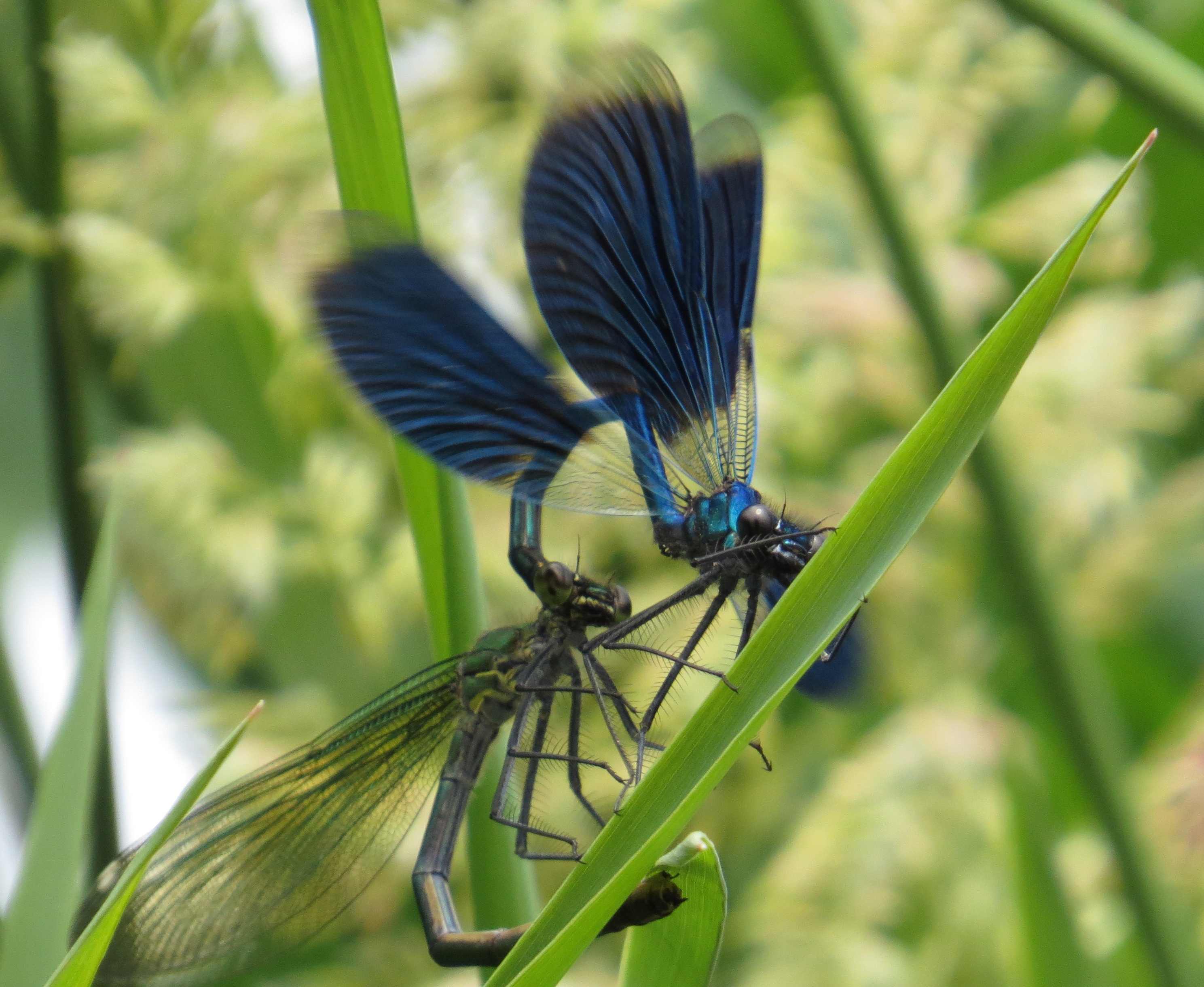 Diese beiden Blauflügel-Prachtlibellen habe ich heute, am 11. Juni 2016, frisch fotografiert, auf der Wümme, etwas oberhalb von Bremen-Borgfeld. Die vordere Libelle ist das Männchen.