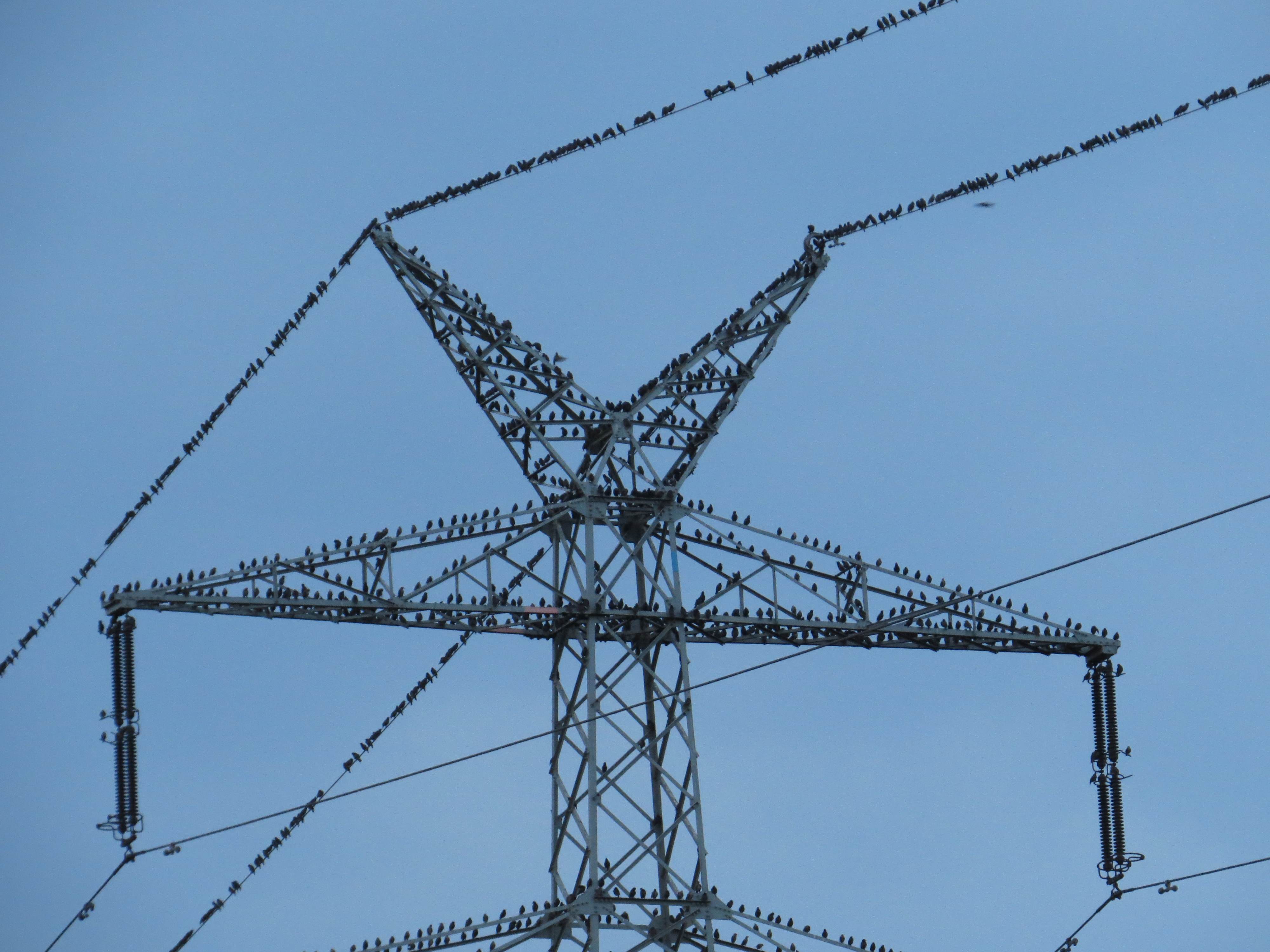 Vorsicht Hochspannung! Für die kleineren Vögeln ist es aber nicht gefährlich, da sie immer nur eine Leitung berühren.
