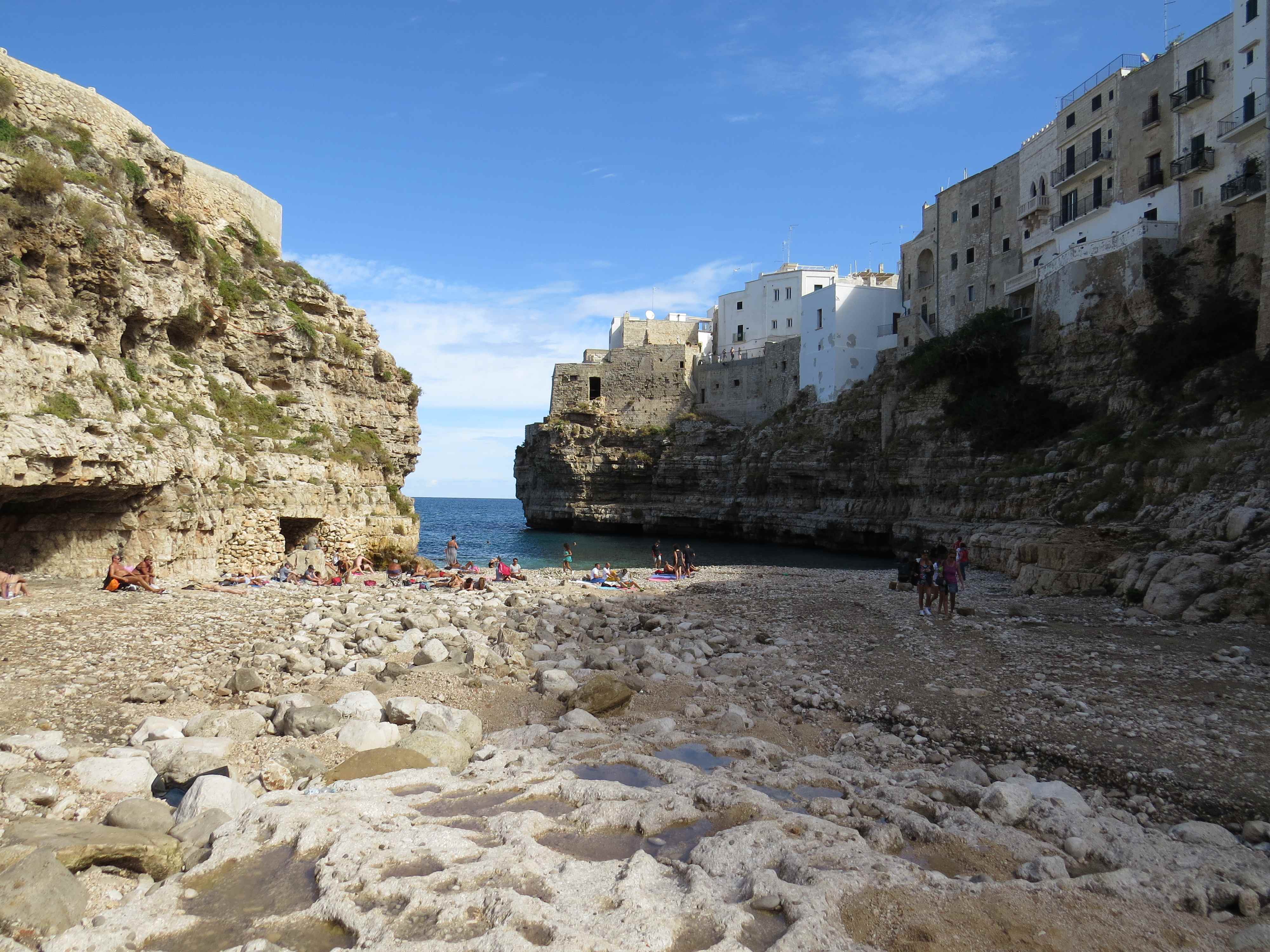 Poliano a Mare hat einen beeindruckenden Strand zwischen den Felsen, allerdings aus Kies…