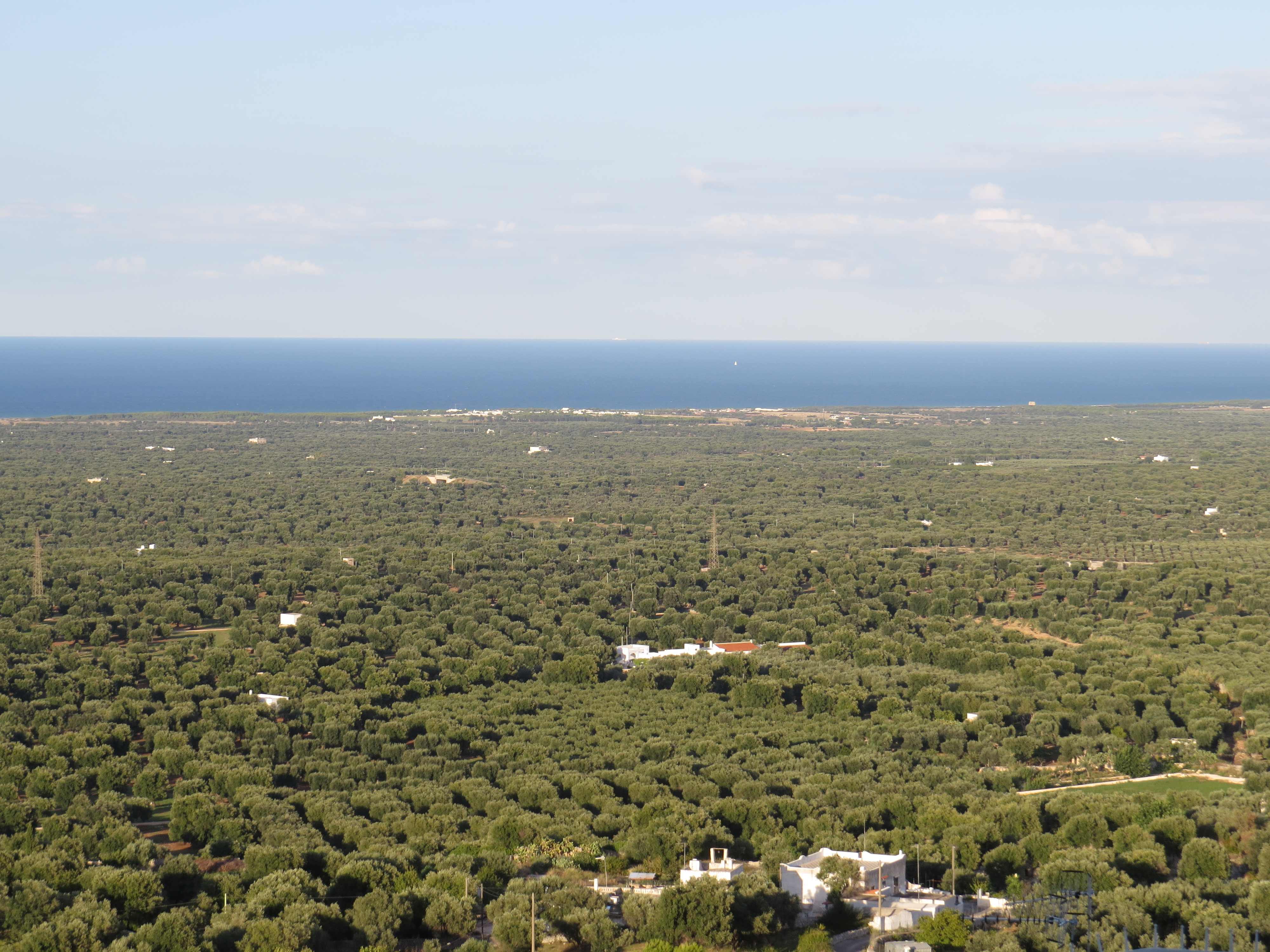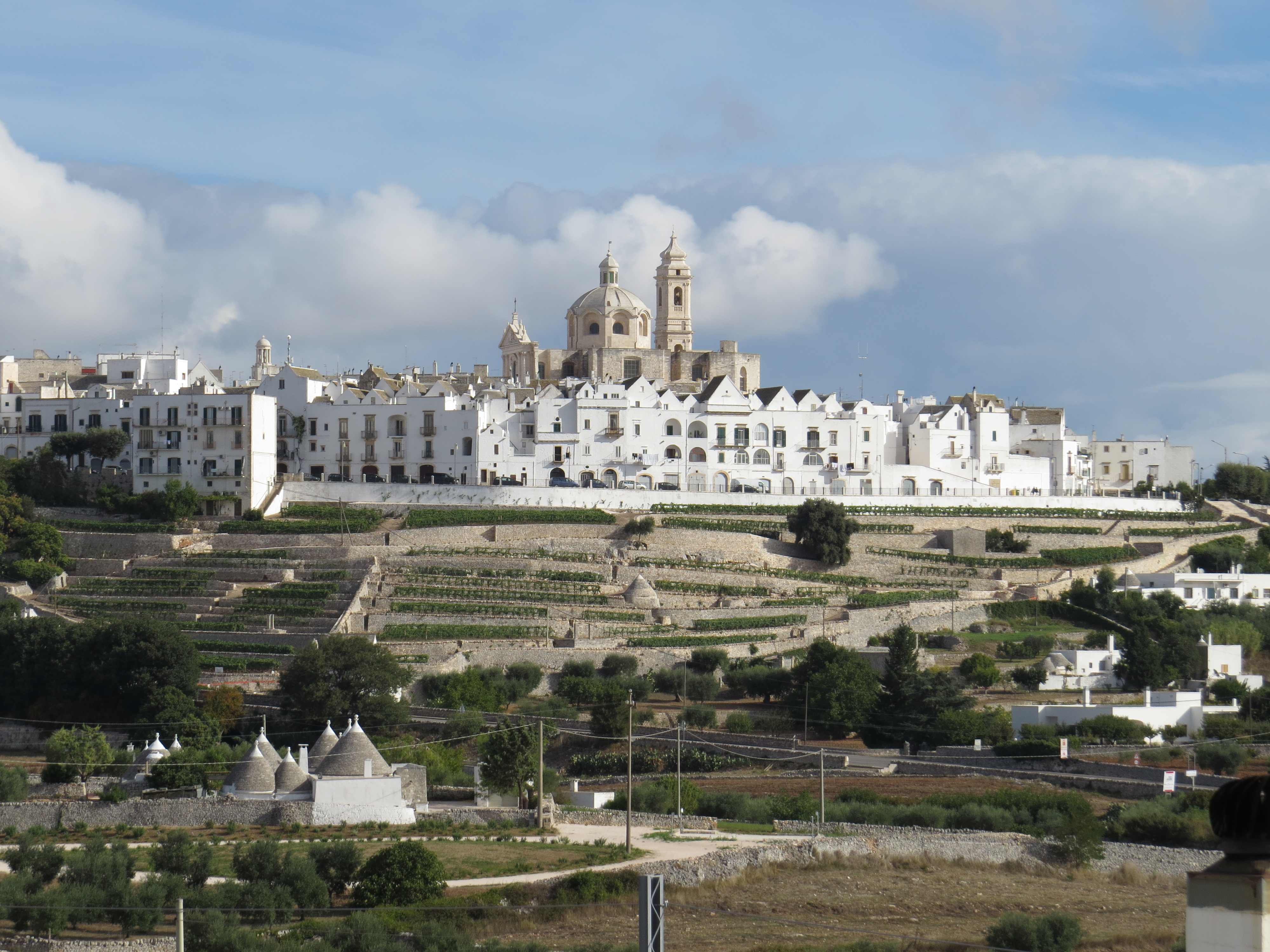 Ostuni liegt auf einem Hügel und sieht von Ferne auch ähnlich aus wie Locorotondo. Von Ostuni kann man allerdings über die Olivenplantagen bis zum Meer sehen.