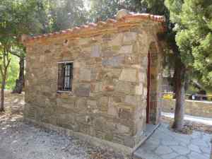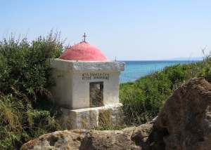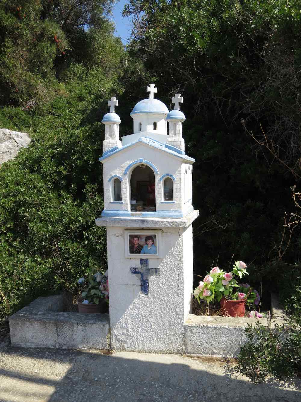Solche Miniaturkirchen sind sehr häufig auf Chalkidiki. Sie werden in großen Mengen zum Kauf angeboten und sind an vielen Stellen am Straßenrand zu finden. Hier ist aber die Besonderheit, dass frische Blumen neben dem Minikirchlein stehen und an ihrem Sockel das Foto von einem Paar angebracht ist. Es macht hier den Eindruck eines Grabes.