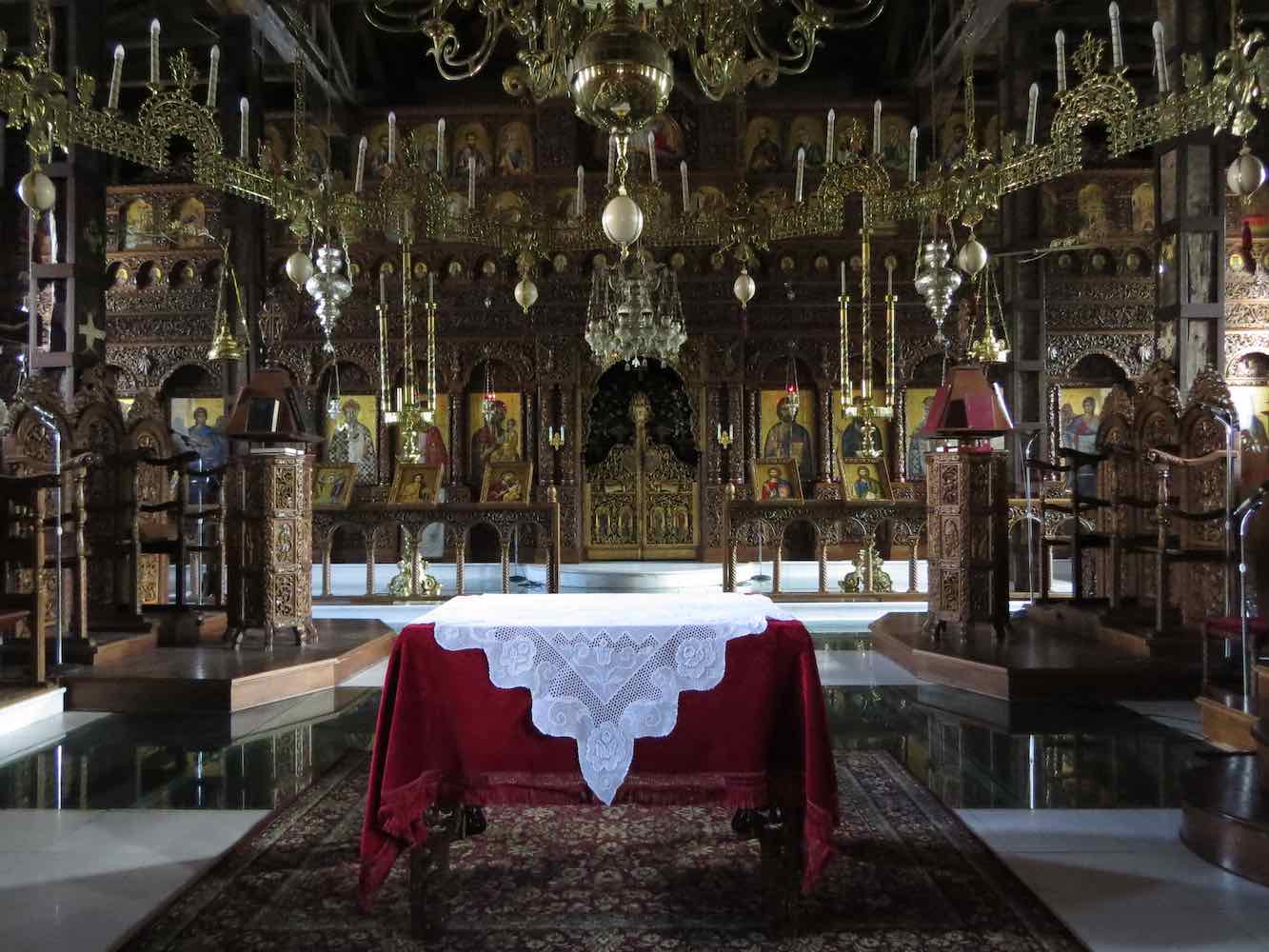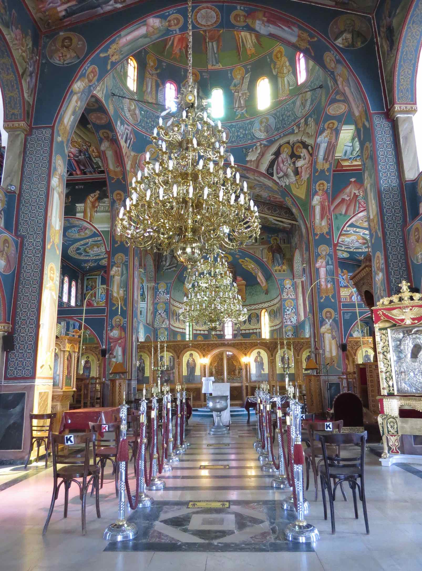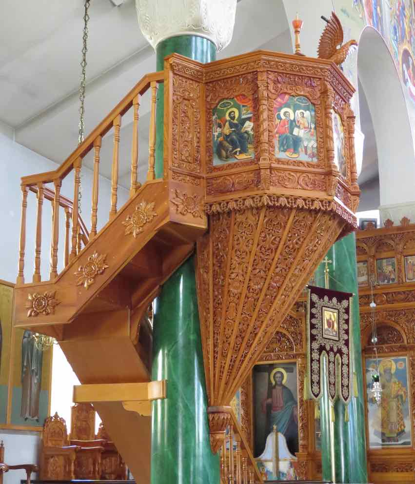 Dabei war das Städtchen Polygyros das erste Etappenziel. Neben der Kirche im Ortskern und vielleicht dem Rathaus, das gut besucht schien, konnten wir dem Ort aber nicht viel abgewinnen. Dir Kirche hatte es allerdings in sich. Sie war innen übersät mit aufwendigen Holzschnitzereien. Hier nur die Kanzel als Beispiel.