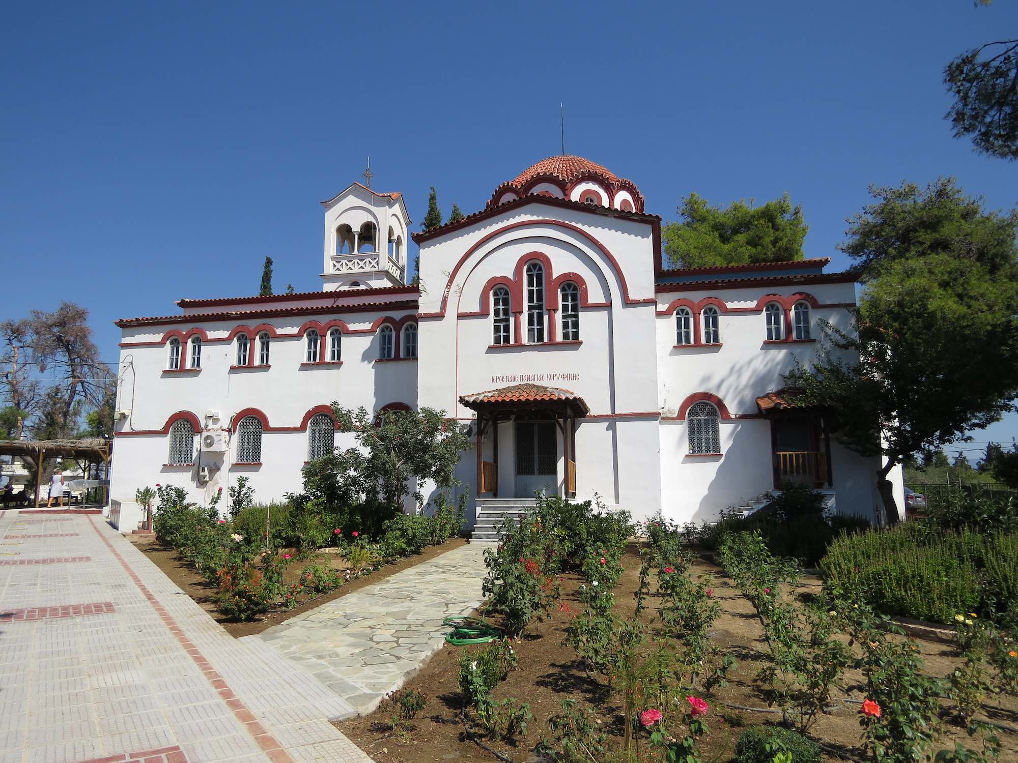 Zum Glück haben wir uns dabei verfahren, weil wir die Adresse nicht richtig ins Navi eingegeben hatten. Wir sind nämlich direkt nach Nea Moudania gefahren, wobei unser Hotel aber einige km hinter dem Ort Nea Moudania liegt. Dabei haben wir eine Griechisch Orthodoxe Kirche (nehme ich jedenfalls an) gesehen, die „Ekklisia Panagia Korifini“.