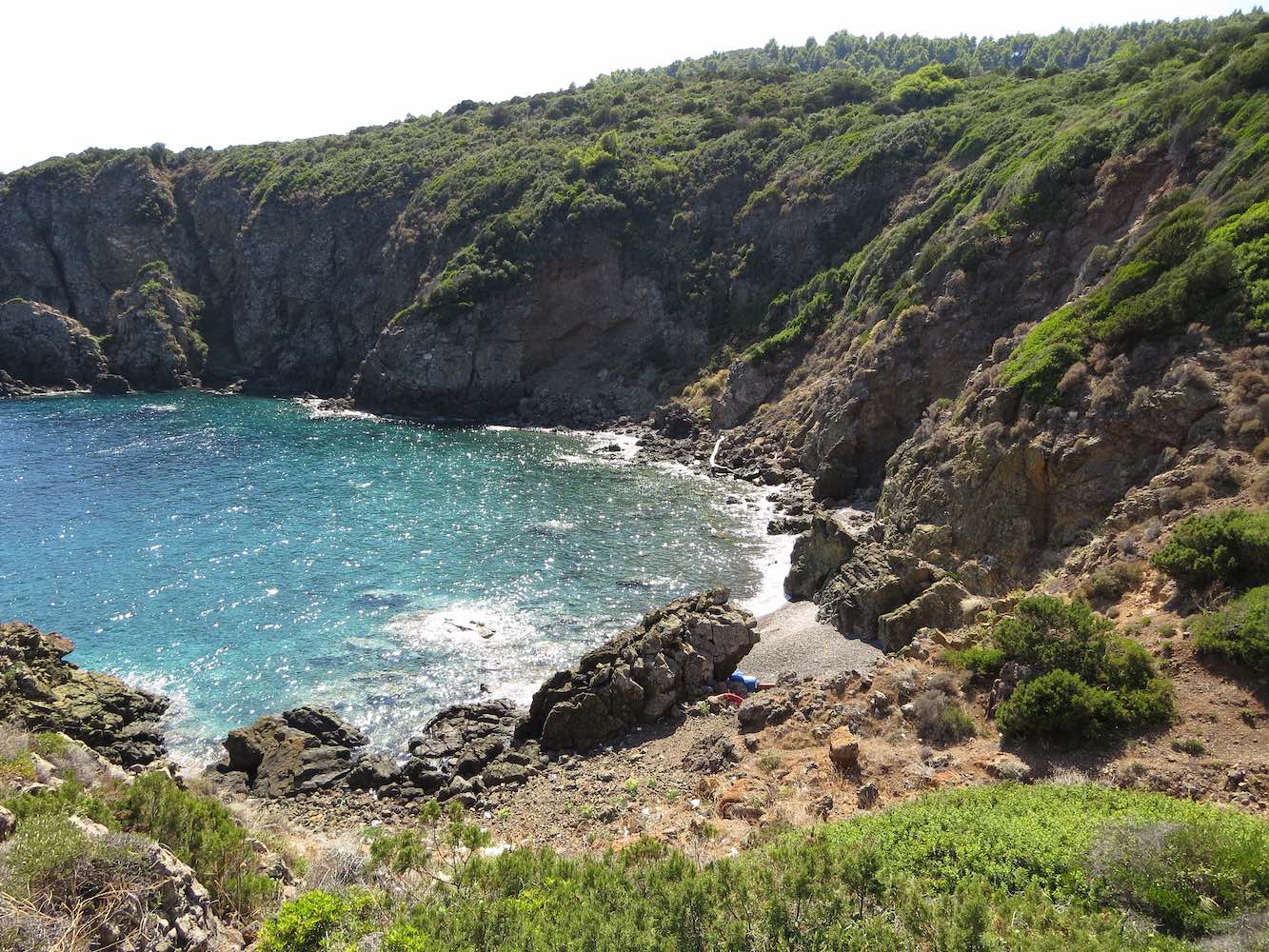 Wir haben wegen der Hitze, es waren all die Tage knapp 30°C, auf eine Bademöglichkeit unterwegs gehofft, und dazu gab es tatsächlich eine Bucht, zu der man allerdings herunter kraxeln musste. Die Bucht war winzig und es gab einigen angespülten Müll, aber ich konnte gut eine erfrischende Runde schwimmen.