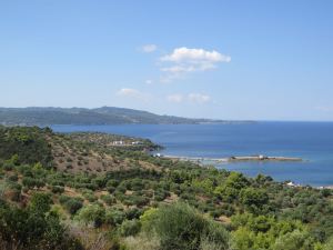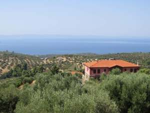 Neben der Küste kann man zudem die Olivenbaum-Monokultur sehen, die auch schon an der Spitze von Kassandra vorherrschte. Das Haus gibt auch die fast einheitliche Bauweise in Parthenonas wieder, nämlich Naturstein im Erdgeschoss und ein rosa Anstrich in der ersten Etage.