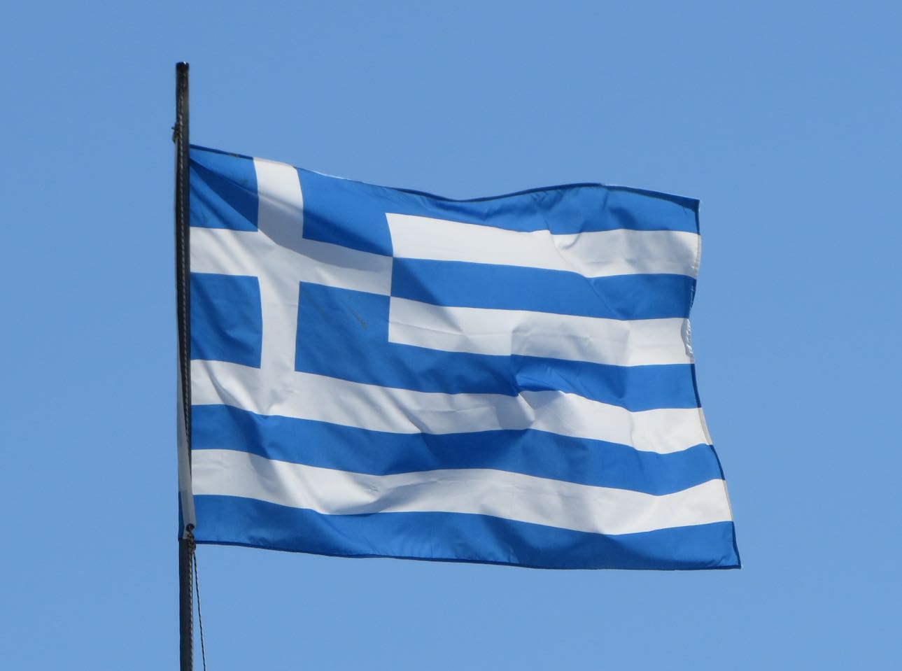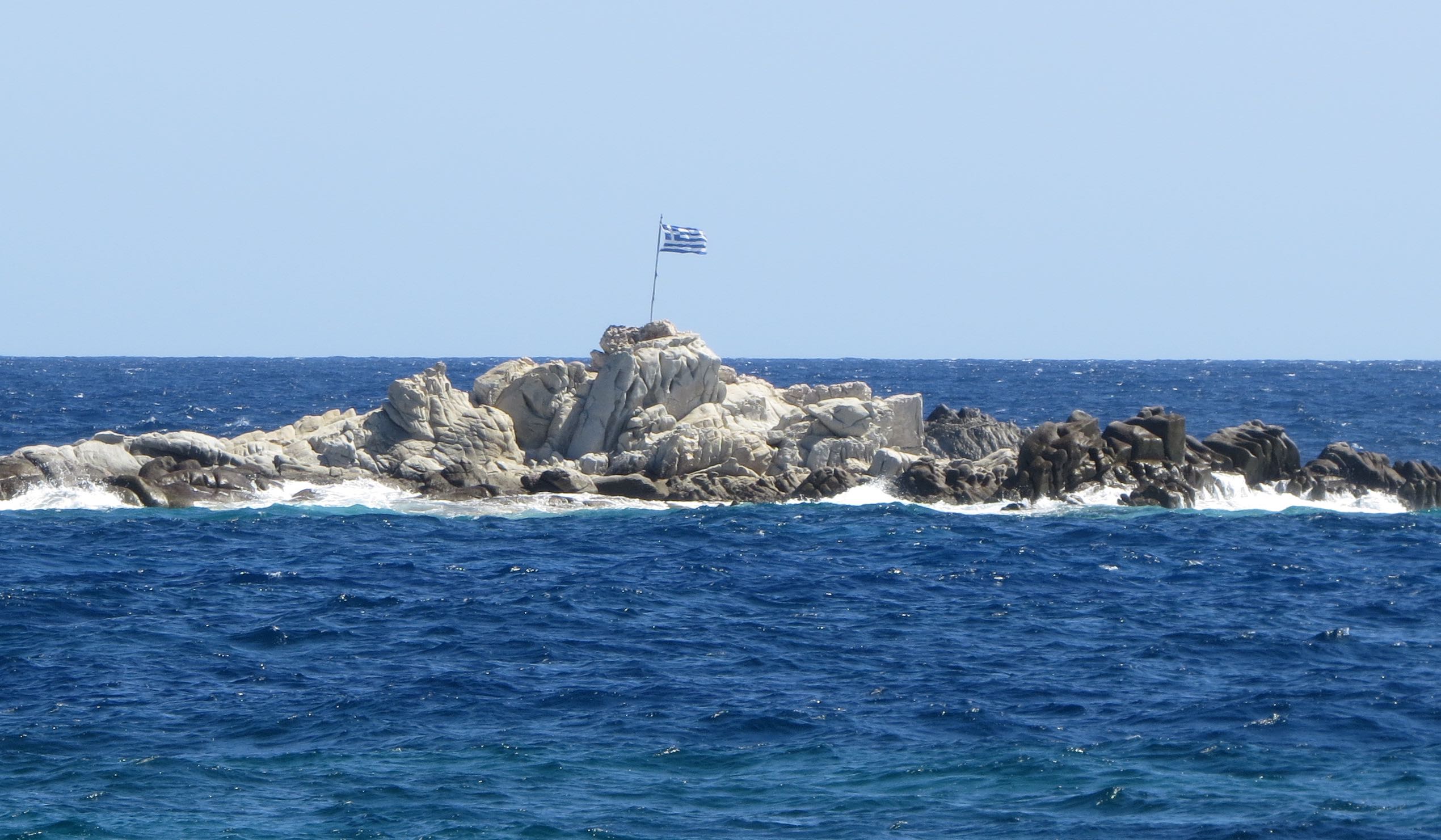 Von dort hatte man auch einen Blick auf diese kleine Felseninsel, die mit der griechischen Flagge etwas wie ein verlorener Außenposten wirkte.