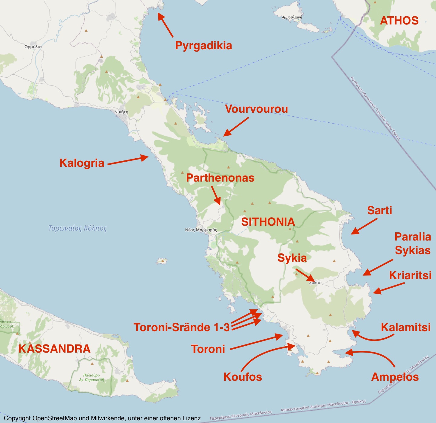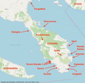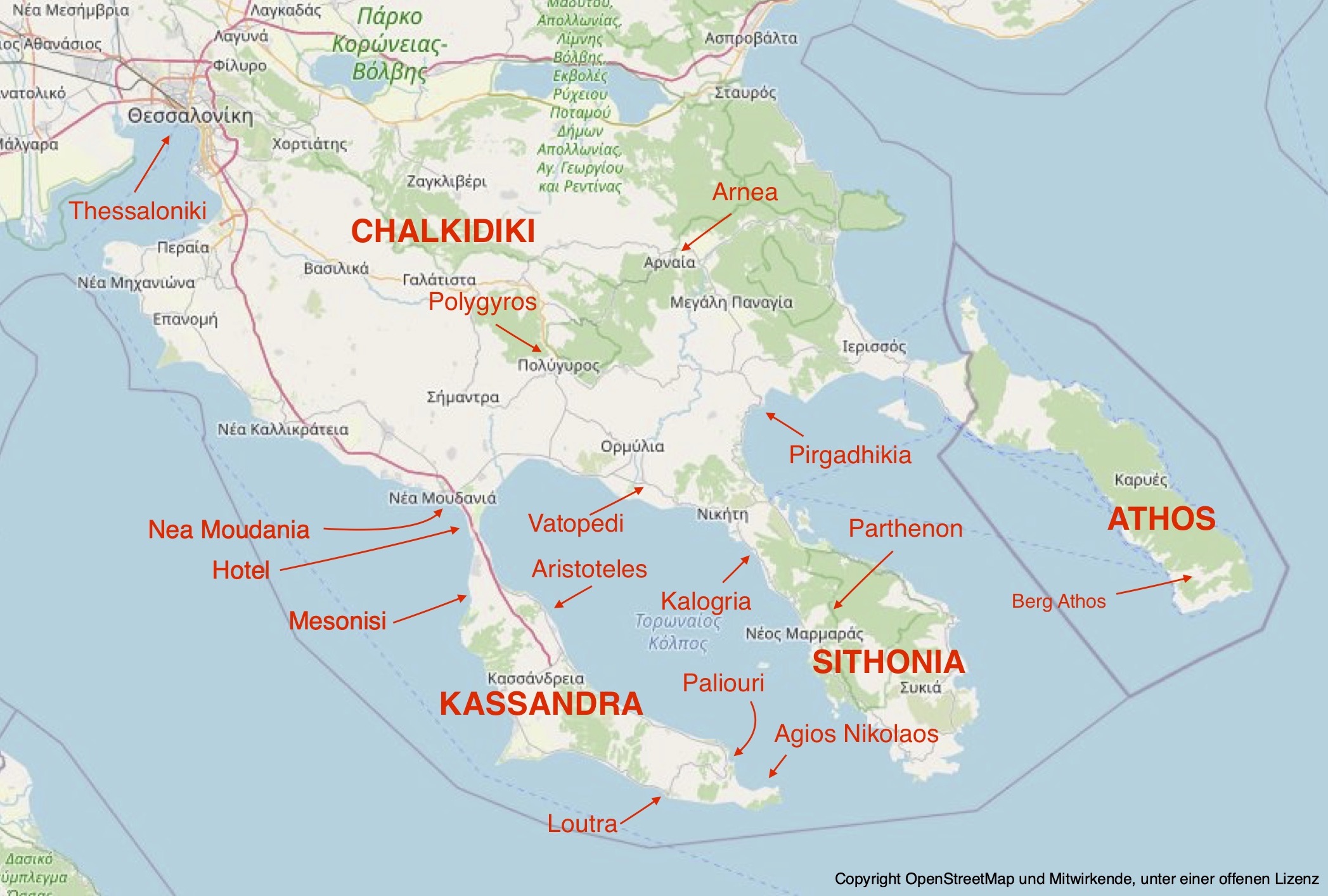 Die Halbinsel hat einen Hauptteil und drei Halbinseln, die auch als Finger bezeichnet werden, nämlich (von West nach Ost): Kassandra, Sithonia und Athos. Das und die meisten unserer Ziele zeigt die nachfolgende Karte. Nur für die Tour am letzten Tag gibt es unten noch eine eigene Karte zu Sithonia.