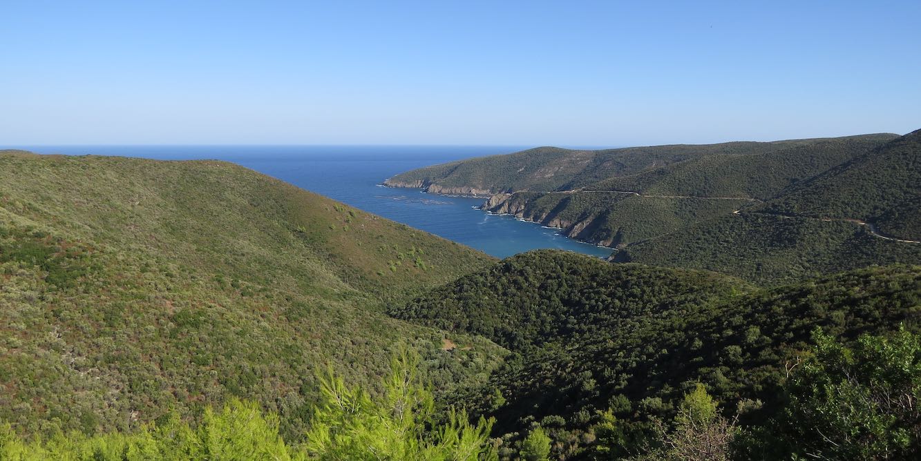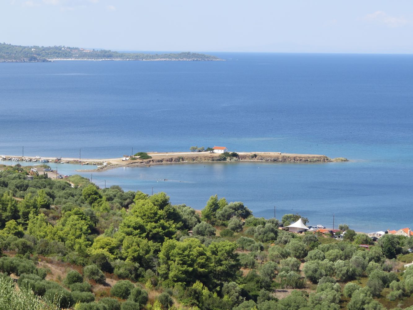 Wir hatten aber schöne Ausblicke auf die letzte Bucht von Kassandra, und auch hinüber zur nächsten Halbinsel, also zum mittleren Finger von Chalkidiki, zu Sinthios. Wir konnten sogar in der Ferne den Berg Athos auf der gleichnamigen Halbinsel sehen, also auf dem dritten Finger. Das folgende Foto zeigt den Blick zurück auf Kassandra, mit der kleinen Kirche auf ihrer Landzunge.