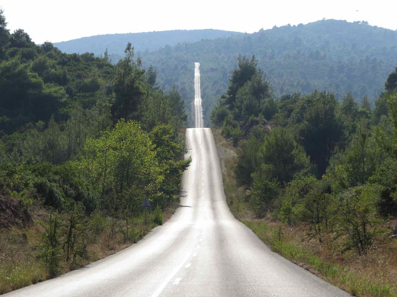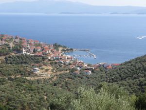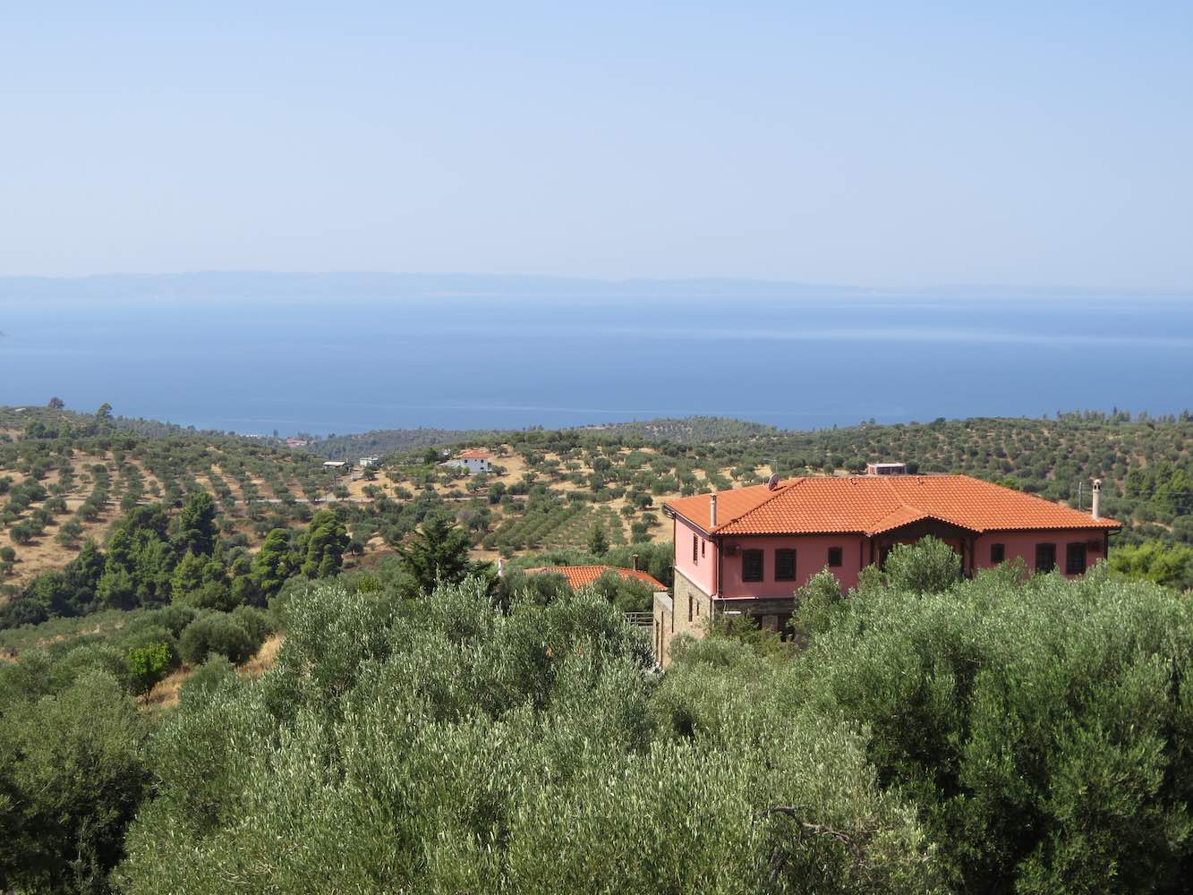 Aber ein typisches Bergdorf darf man nicht erwarten. Immerhin führt die Straße zu Paul’s Taverne, von der aus man einen super Blick auf die Küste hat. Im Hintergrund ist am Horizont die Nachbarhalbinsel Kassandra zu sehen.