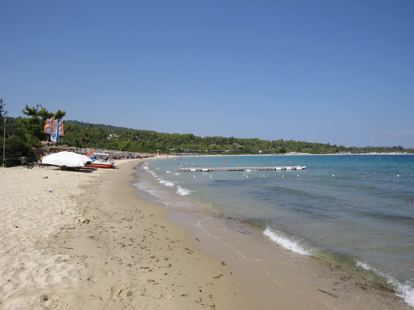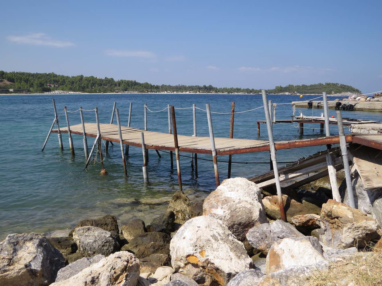 Der wurde wohl auch in irgendeinem Reise-/Strandführer als einer der schönsten Strände, wenn nicht als der schönste Strand Kassandras angepriesen.. Die Bucht ist auch wirklich ganz schön, aber ohne Strandbar mit Beschallung geht es wohl nicht. An einem anderen Ende steht eine Reihe halbfertiger Flachbauten aus Beton, die oben im Bild auch zu sehen ist. Außerdem wurde einiges an Müll angespült.
