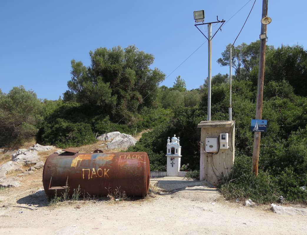 Nach dem Eiskaffee bei Paul’s einschließlich sehr interessantem Gespräch mit dem Kellner, war eine kleine Wanderung entlang der Küste geplant. Die Wanderung fiel aber aus, weil sich die geplante Strecke als Strecke auf Privatgrundstück entpuppt hat, nämlich wohl auf dem Grundstück des Reeders Giannis Carras bzw. seiner Erben. Dann haben wir eine Zeitlang nach einem Strand in der Nähe gesucht, der nicht privat ist, sind aber nicht fündig geworden.