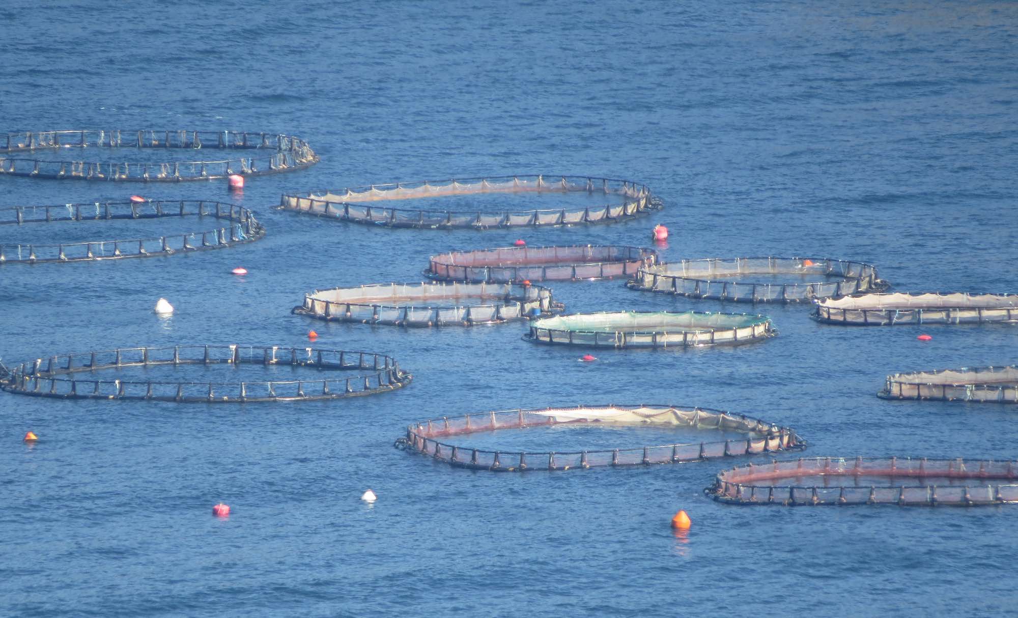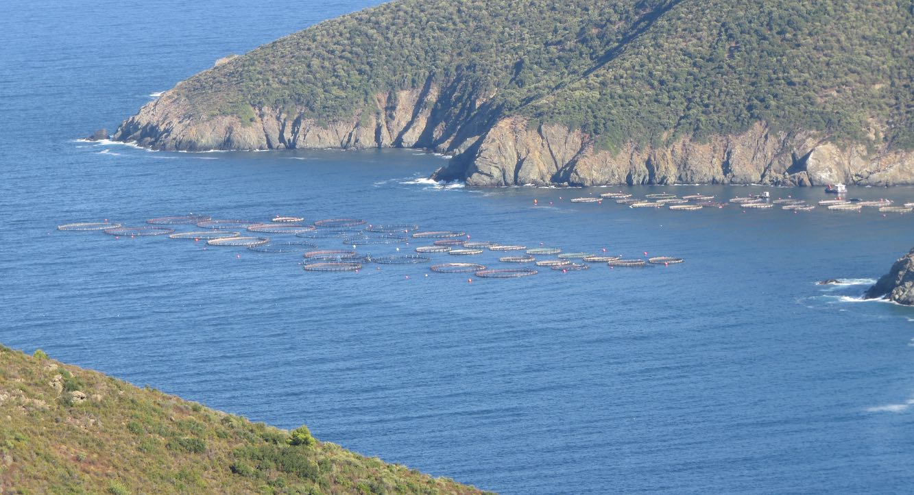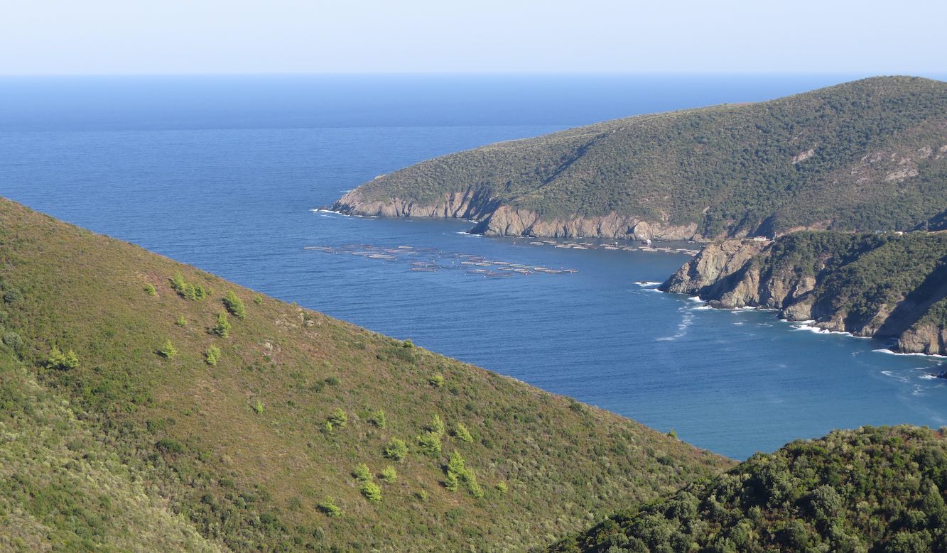 Es gab an der Ostseite auch noch eine letzte große Bucht, in der riesige Kreise im Wasser aufgefallen sind. Die sollen der Fischzucht dienen. Nehme an, dass daran Netze aufgehängt sind, innerhalb derer die Fische gehalten werden. Die Bucht bzw. der Strand dazu soll Ampelos heißen. Die folgenden Fotos zeigen diese Bucht mit den Kreisen in unterschiedlichen Zoom-Stufen.