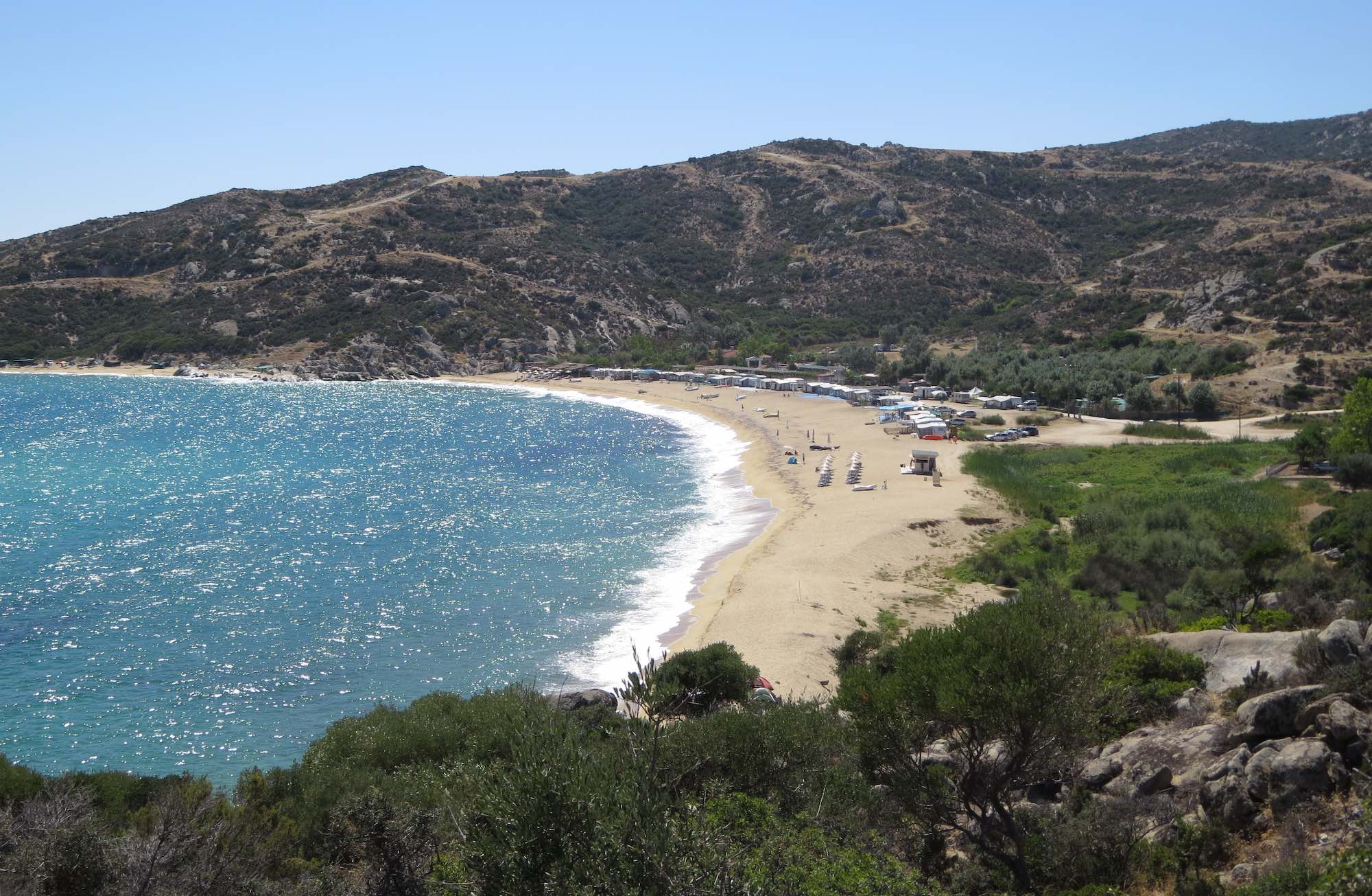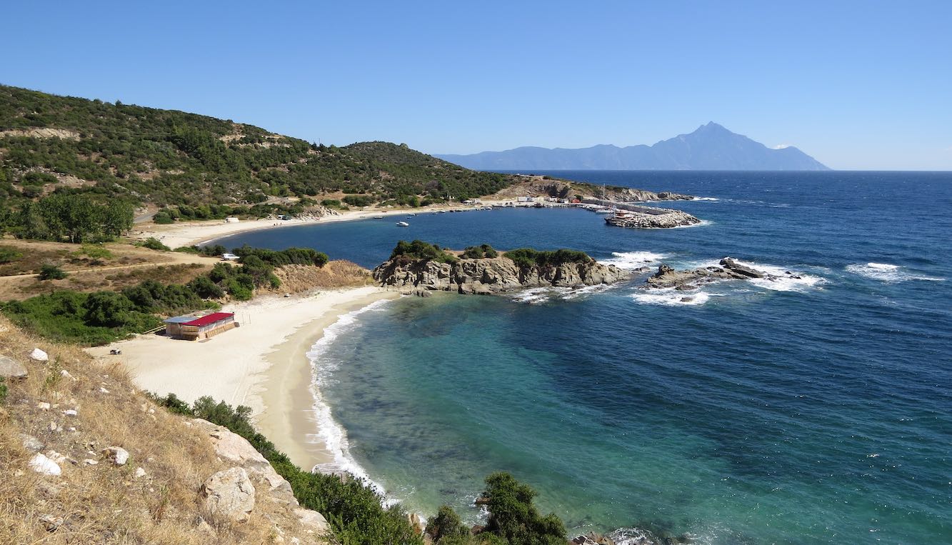 Die Bucht mit dem großen, sichelförmigen Strand war ganz nett. Es gab aber auch noch einen abgelegeneren Strand, in einer Nebenbucht. Dazu führte ein (kurzer) Weg über die Landzunge und diese Nebenbucht war kleiner und noch geschützter. Dort gab es allerdings ein paar Camper, die sich an der Rückseite des Strandes eingerichtet haben. Im Hintergrund ist übrigens wieder der Berg Athos zu sehen.