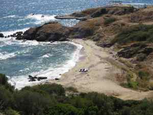 Auf dem Rückweg haben wir denn Halt bei einem an sich schönen sichelförmigen Strand gemacht. Im Hintergrund sind wieder die Olivenbaum-Monokulturen zu sehen.